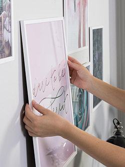 Odabir okvira pomaže u postavljanju tona za zid slika. Uobičajeno je birati okvire u jednoj ili dvije boje kako bi se osiguralo da sve slike na zidu budu povezane na prirodan način. Ako želite dramatičniji efekt, slobodno možete odabrati suprotno i miješati i usklađivati okvire za slike u potpuno različitim bojama, oblicima i izvedbama.