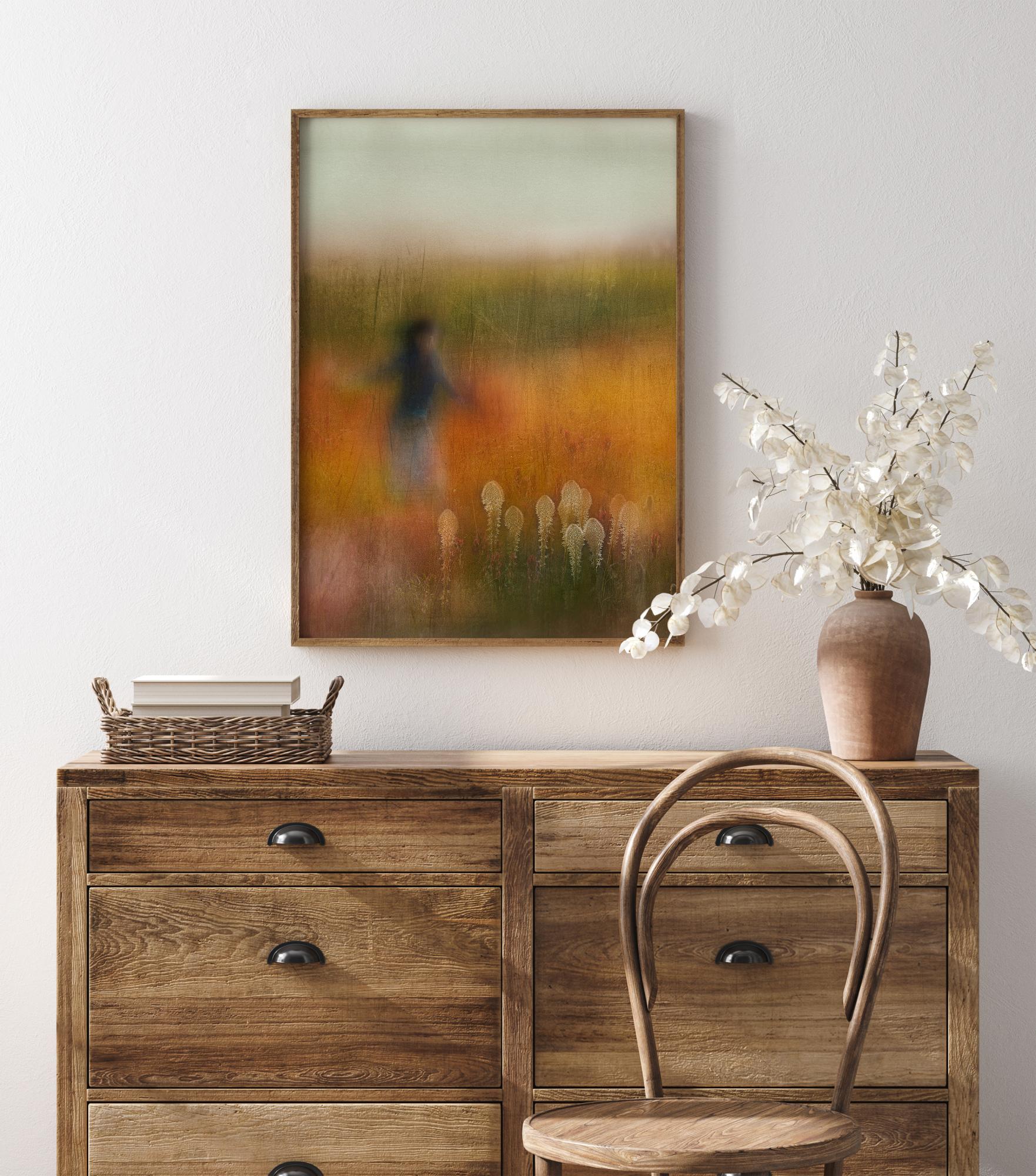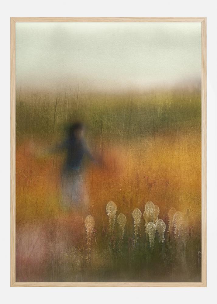 Apstraktni poster s djevojkom u visokoj medvjeđoj travi. Slika izgleda kao meka slika sa žutim i zelenim bojama koje dočaravaju osjećaj proljeća. Zamutrena djevojka kreće se kroz snažne poteze kistom u travi kako bi stvorila pokret u cijeloj slici. Objesite ga u svom domu kako biste imali sjajan pokretač razgovora.