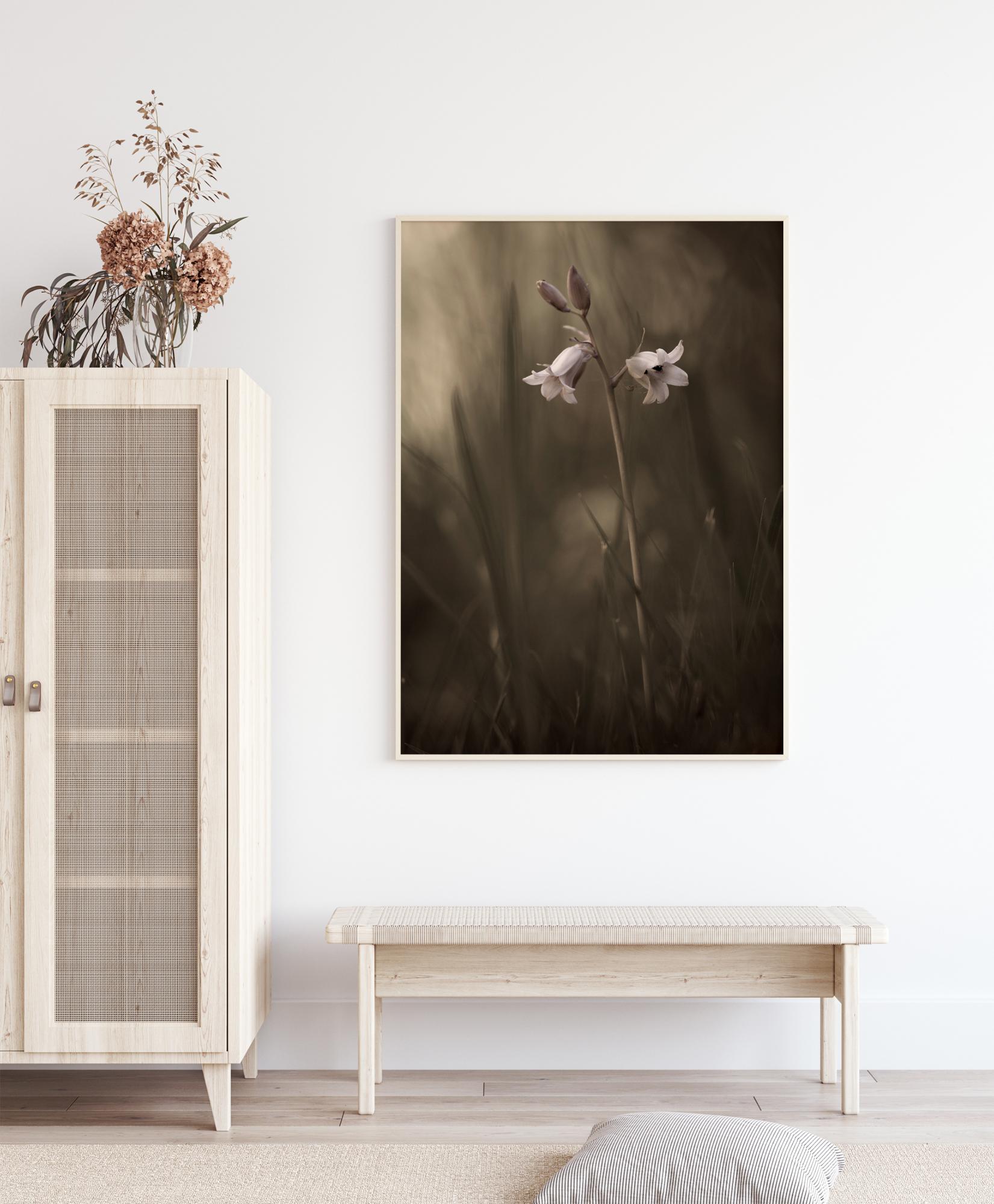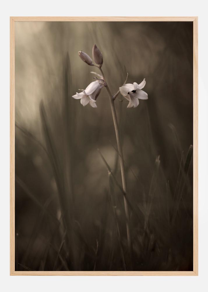 Meka poster bijelog cvijeta na mutnoj pozadini. Bijeli i ružičasti cvjetovi u obliku zvona kontrastiraju s mekim poljem trave iza. Kombinirajte ovaj jednostavni poster u zelenkastim tonovima sa svijetlim zidom kako bi cvijeće još više istaknulo na ovoj diskretnoj posteru.