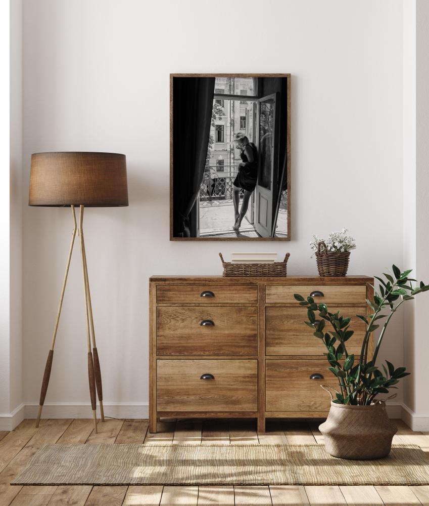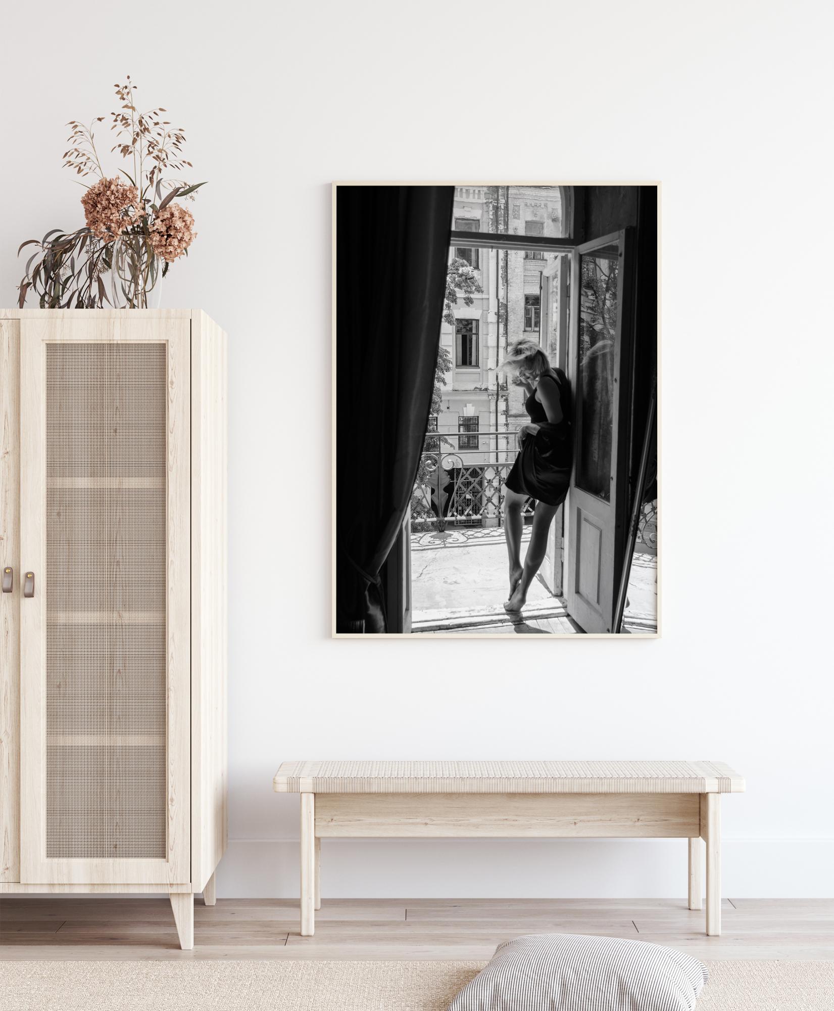 Klasičan poster s ženom na balkonu u Parizu. Žena nosi crnu haljinu koja produžava njezine gole noge dok se oslanja na vrata, stojeći na prstima i gledajući svoje noge. Kombinirajte ovaj crno-bijeli poster s nježno obojenim zidom kako biste postigli dašak elegancije.