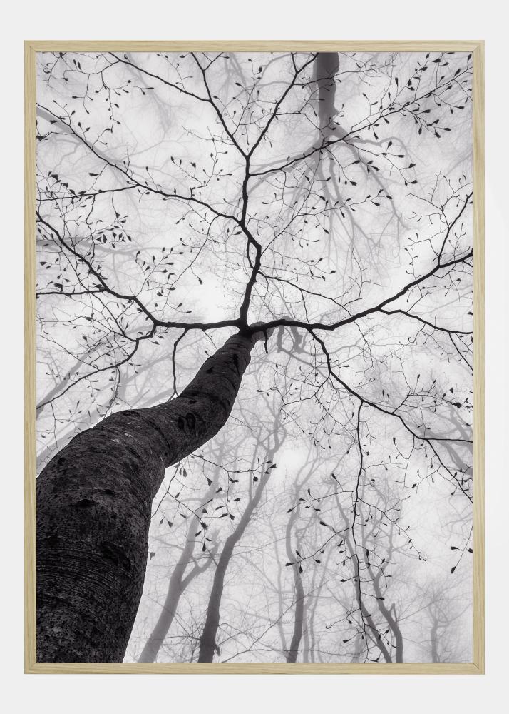 Poster prirode s debla stabla koje se proteže prema nebu. Neka pogled prati deblo prema granama koje se šire prema nebu. Drveća s mekim fokusom ispunjavaju pozadinu svojim lišćem. Ova crno-bijela slika je dobar dodatak na vašem zidu koji vam omogućuje da osjetite mir prirode.