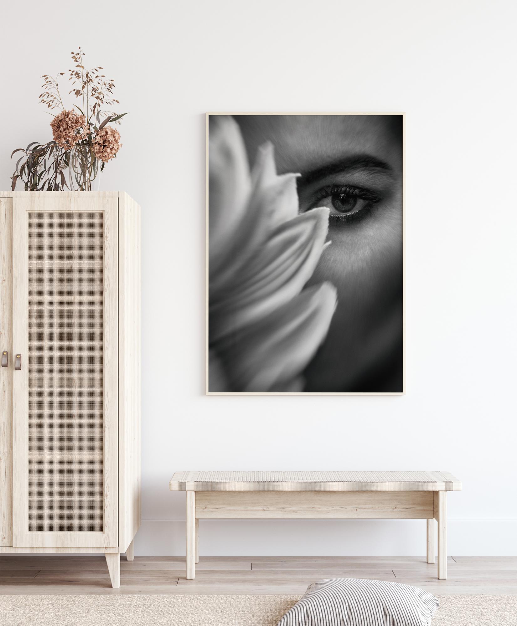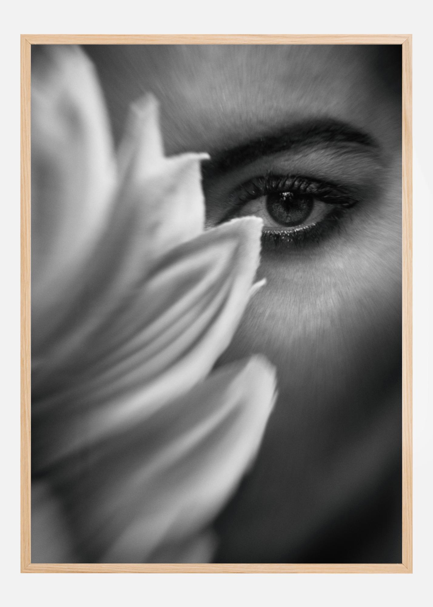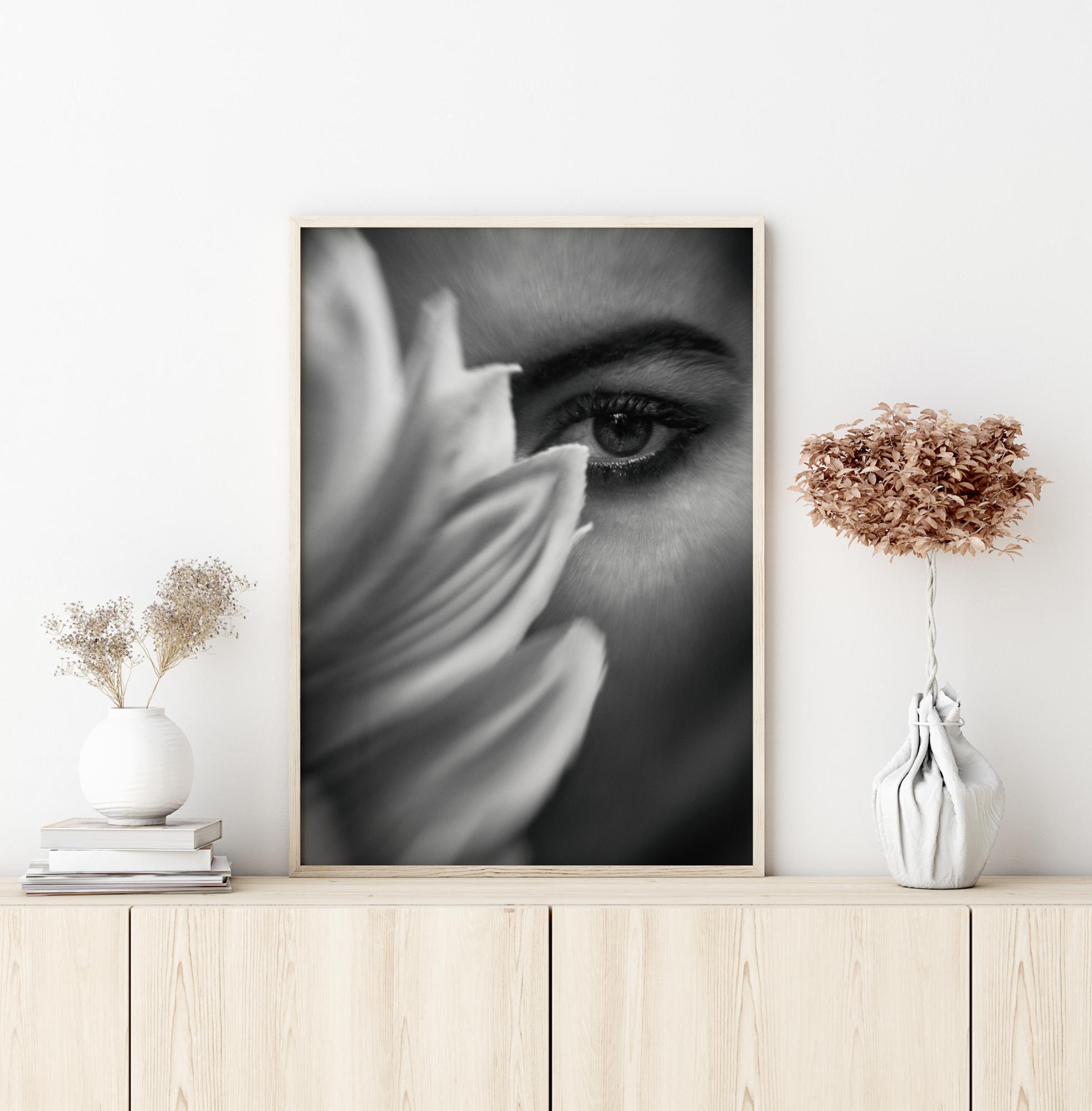 Prekrasan poster s cvijetom i ženskim okom izbliza. Mekani crno-bijeli tonovi omogućuju da se istakne među svim bojama. Pretvorite bilo koju sobu u mirno mjesto za duhovno promatranje.
