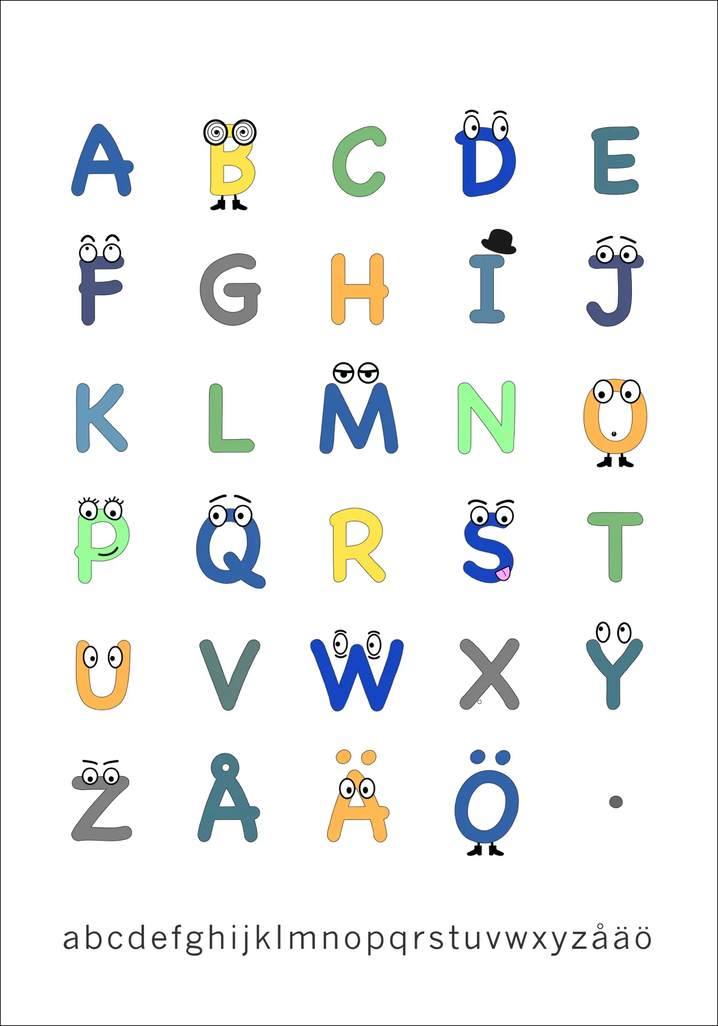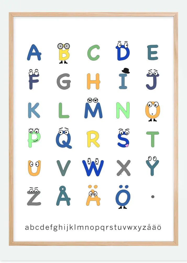 Slatki poster s abecedom koji prikazuje svako slovo na domišljat način. Uživajte u primarnim bojama na ovom jednostavnom, ali pamtljivom posteru. Neka slova također imaju oči kako bi stvorila osobni karakter slova. Objesite ga na zid kako bi djeci omogućili lakše pamćenje abecede i učinili školsko vrijeme i učenje zabavnijim.