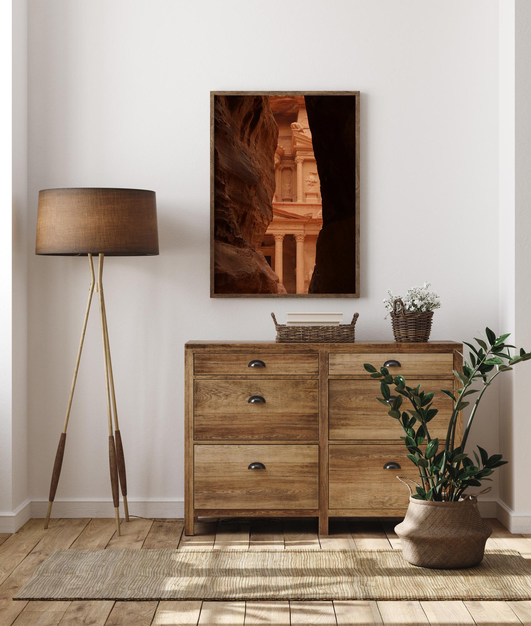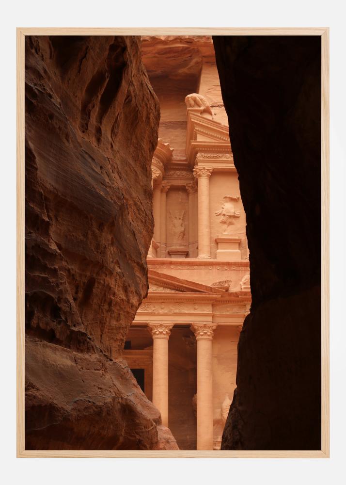 Plakat s prikazom kutka Petre u Jordanu. Pogledajte dio fasade kroz crvene stijene ovog fantastičnog čuda antike. Objesite ga kod kuće i krenite na putovanje bez napuštanja kuće, dok istražujete staru arhitekturu ovog slavnog mjesta.