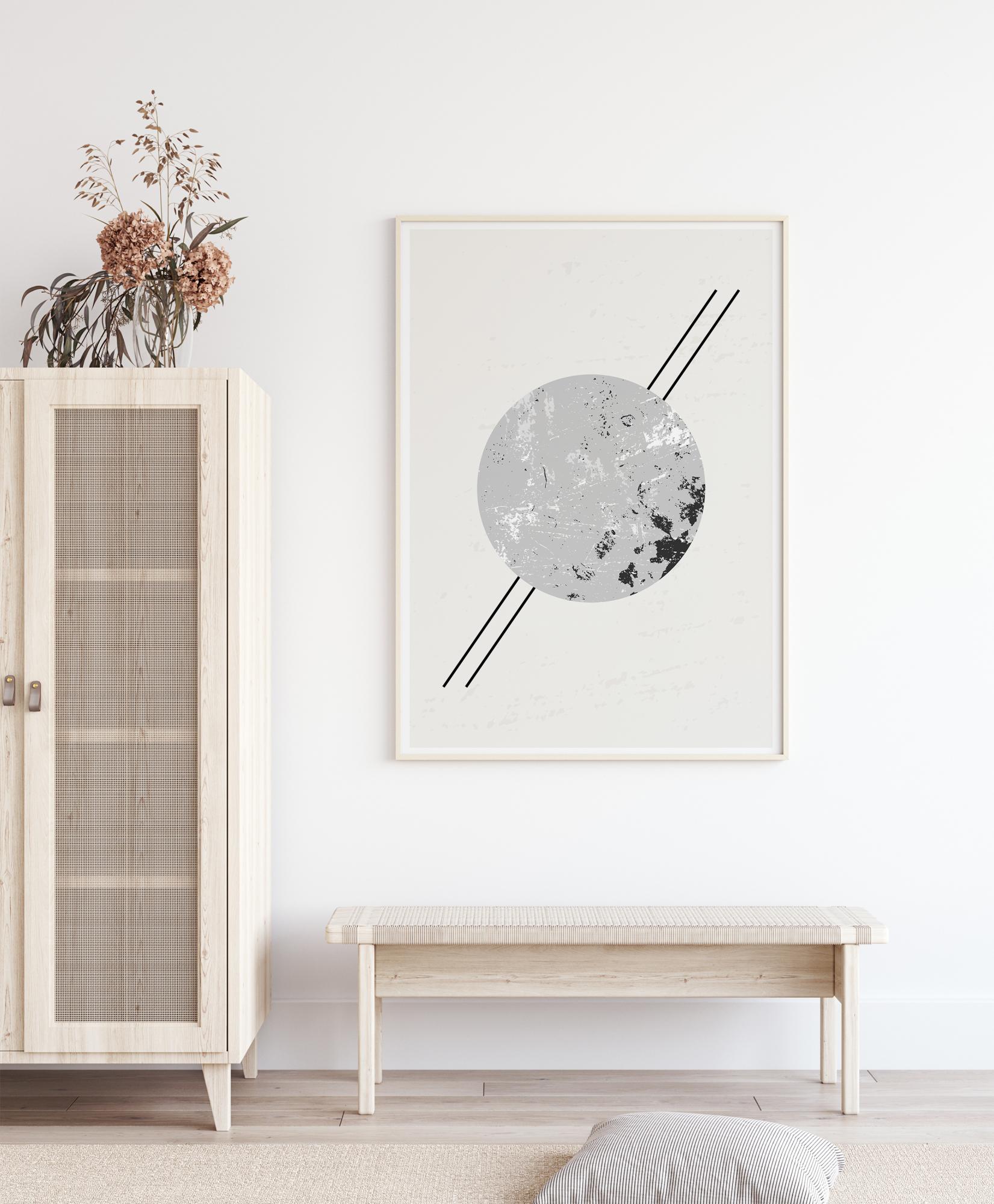 Apstraktni poster s krugom s dvije ravne linije koje prolaze kroz njega. Mekani sivi tonovi kruga kontrastiraju s tamnosivim i bijelim mramornim efektom, što gotovo izgleda kao Zemlja iz svemira. Postanite kontemplativni kada ovo visi na zidu s nježnim pastelnim bojama.