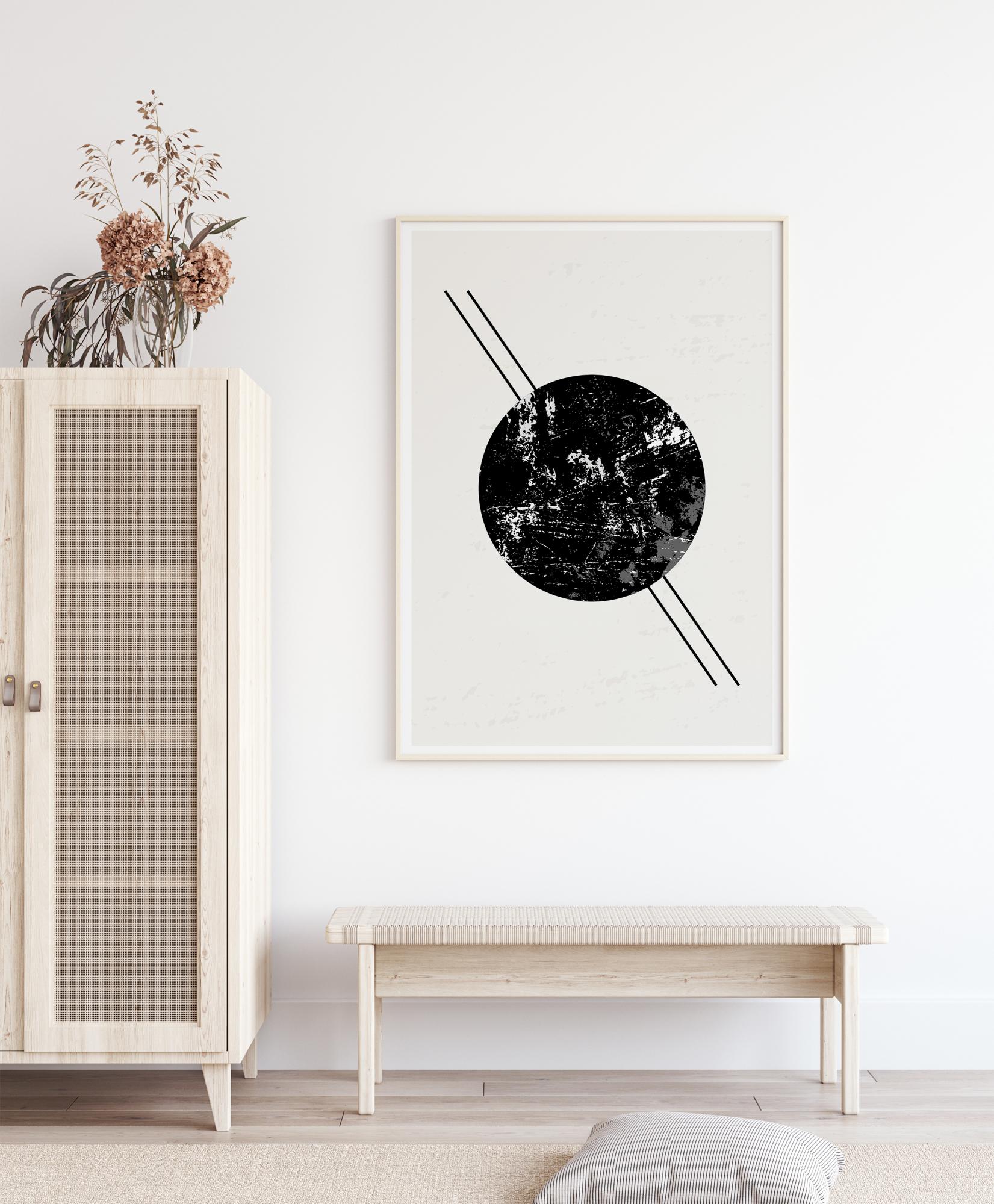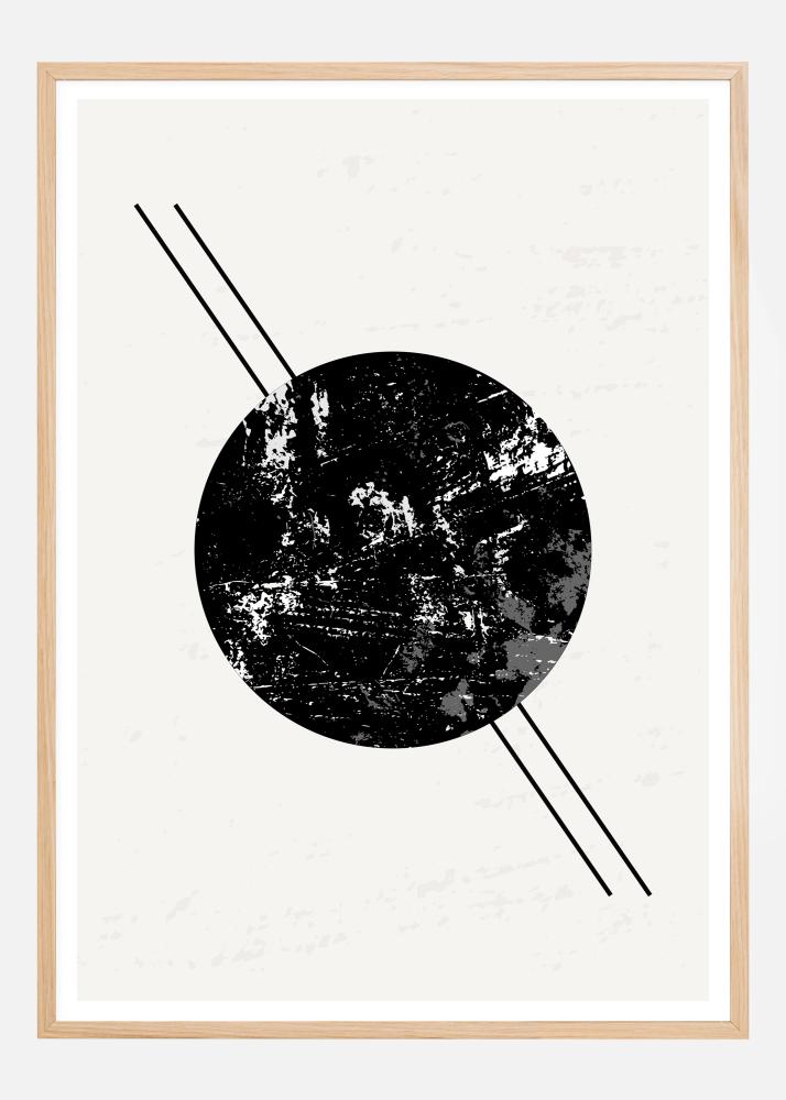 Snažan apstraktni poster s crnim krugom s dvije linije koje se protežu od gornjeg lijevog do donjeg desnog kuta. Crni krug ima bijeli i sivi mramorni efekt gdje dvije crne linije gotovo tvore Saturnove prstene. Ponesite ovo kući i vidjet ćete sve mogućnosti u ovom umotvornom umjetničkom djelu.