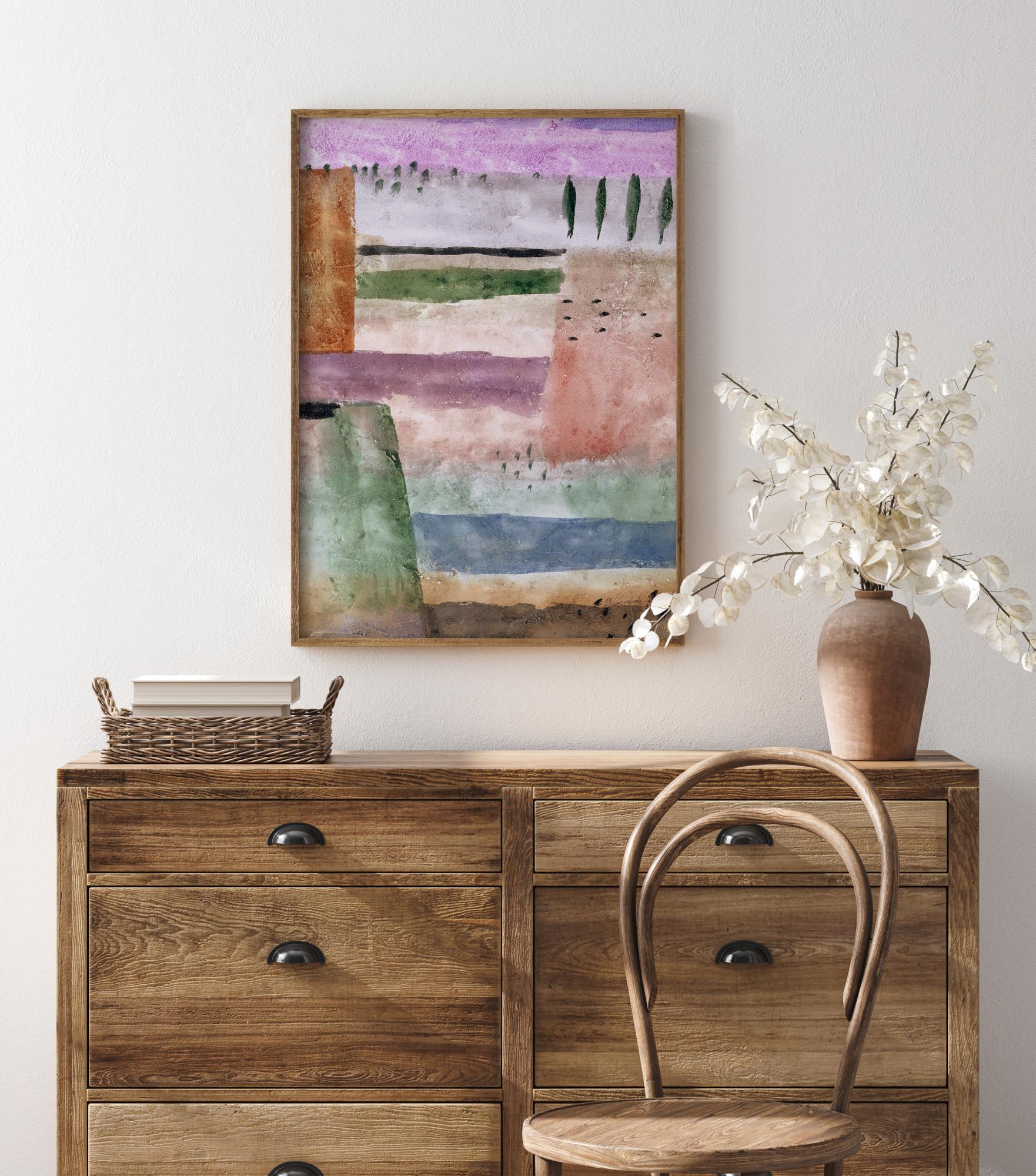 Apstraktni poster u pastelnim bojama s osjećajem slojevitosti i teksture. Poster prikazuje ono što izgleda kao plaža, more, planine, trava i drveće koje nestaje u daljini. Postoji nekoliko plavih, ljubičastih, narančastih i zelenih polja u nježnim pastelnim bojama. Ova mirna scena smiruje um.