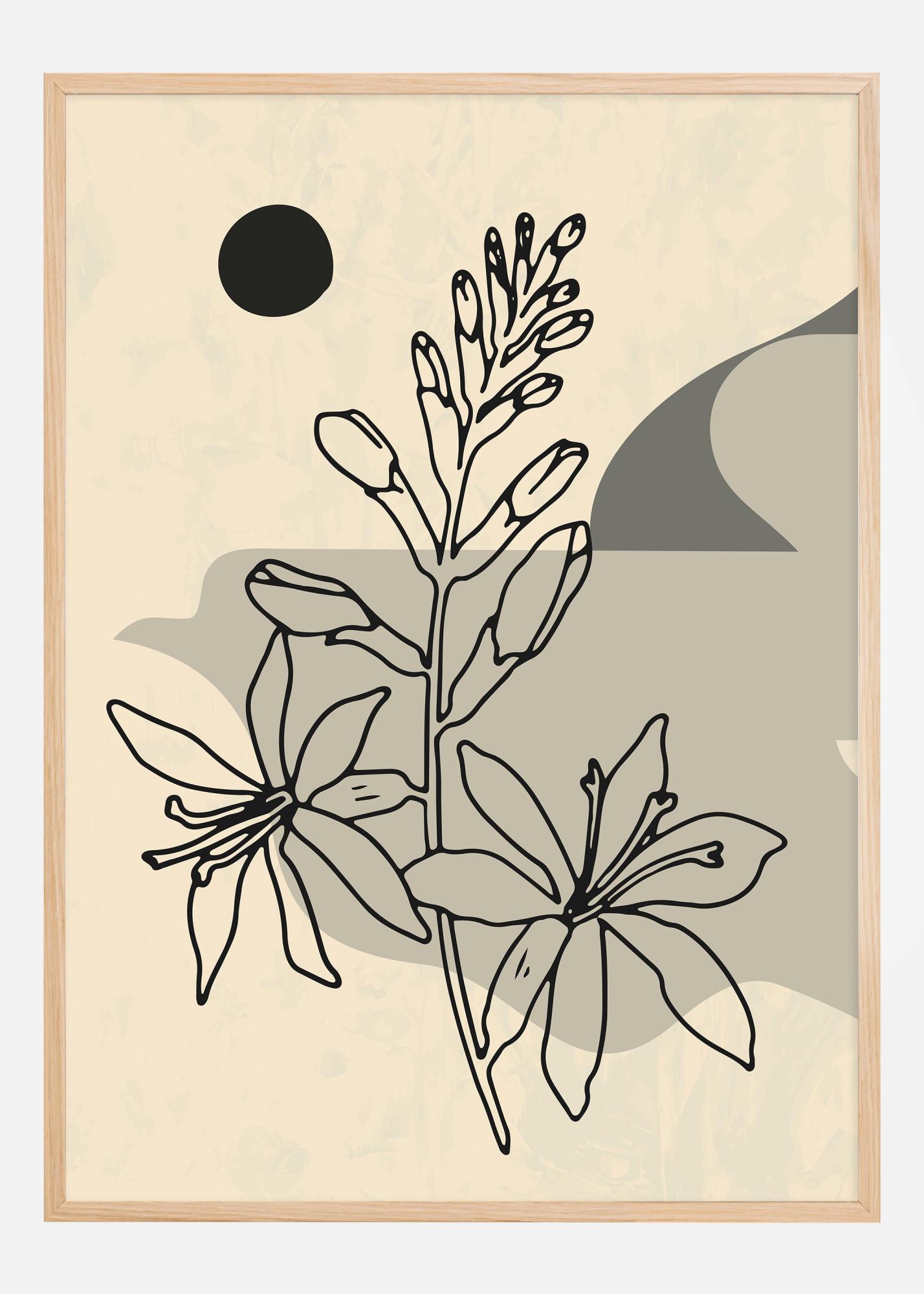 Ovaj estetski privlaÄan plakat bilježi apstraktno tumaÄenje cvjetova u cvatu, gdje se grafiÄke linije susreÄu s organskim oblicima. Djelo se igra s neutralnom pozadinom u bež boji, dopunjeno tamnim, kružnim oblikom koji daje kontrast i dubinu. U prvom planu stilizirani cvjetovi i pupoljci protežu se prema gore u silueti, stvoreni oÅ¡trim crnim konturama koje pružaju snažan vizualni dojam.