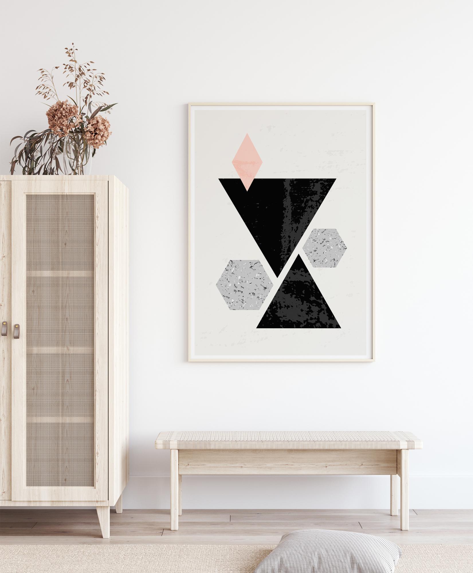 Jak plakat jakih geometrijskih oblika pun apstraktnih oblika koji se svi spajaju u kohezivni dizajn. Dva velika crna trokuta stoje zajedno i formiraju pješčani sat. Oko njih je ružičasti dijamant i dva plava kamena šesterokutna oblika, koji se svi dobro uklapaju u ovu snažnu i zanimljivu sliku. Objesite ovu sliku u hodnik kako biste napravili snažnu izjavu.