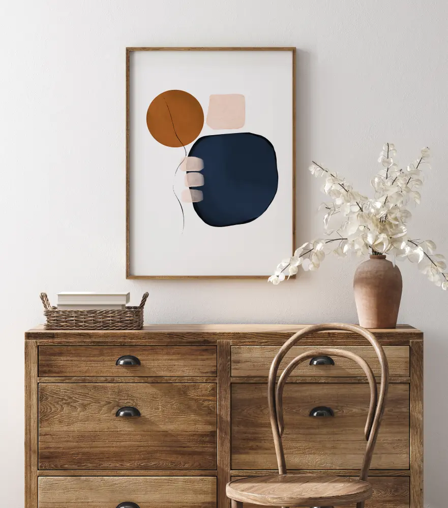 Jednostavan apstraktni poster u 3D-stilu. Veliki plavi oblik privlači pažnju na desnu stranu djela. Mekane pastelne četvorine i tanki potez kistom vode pogled prema gore i vode oko prema smeđem krugu. Razmislite o ovoj slici dok visi na vidljivom zidu u vašem domu.