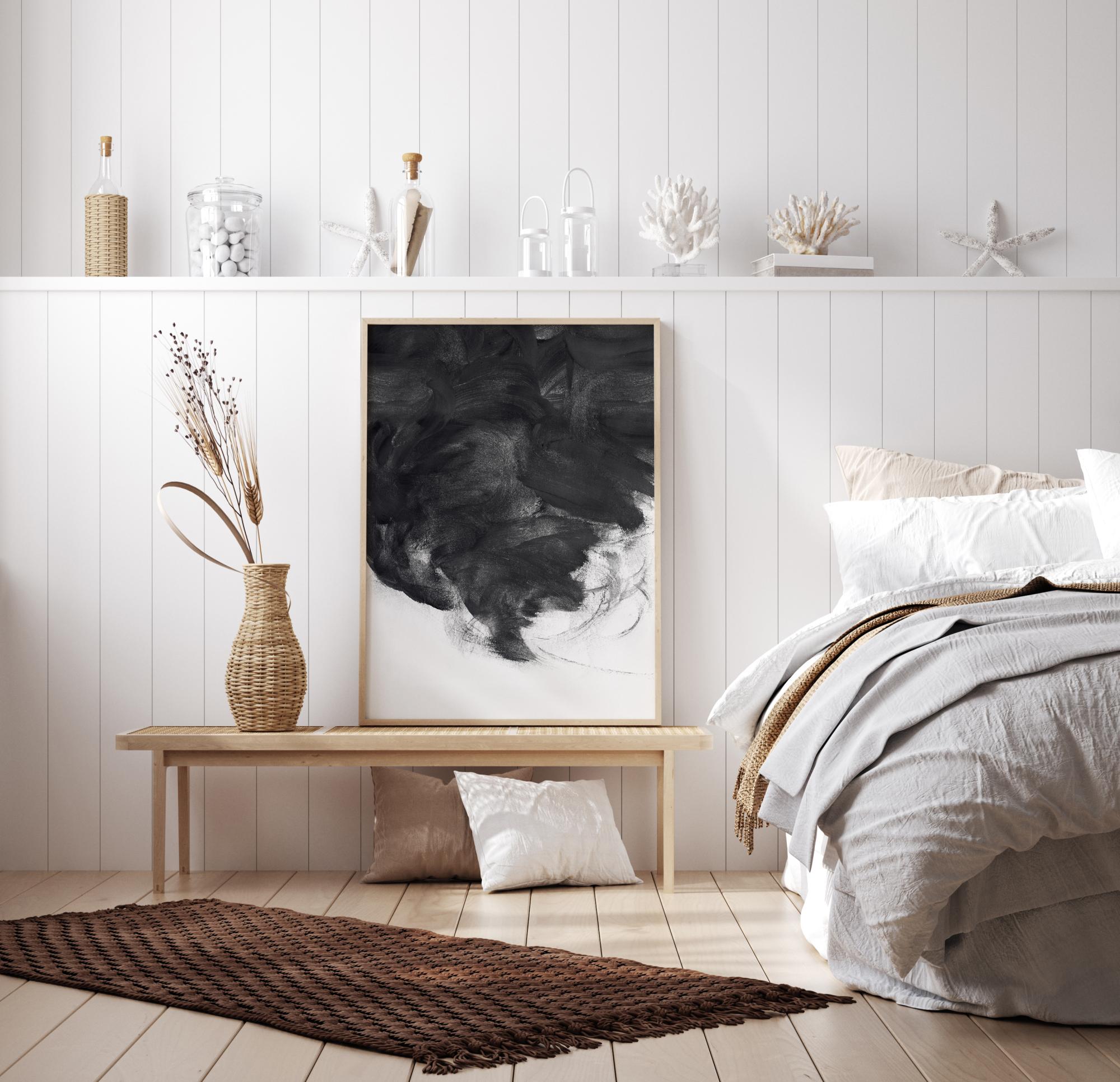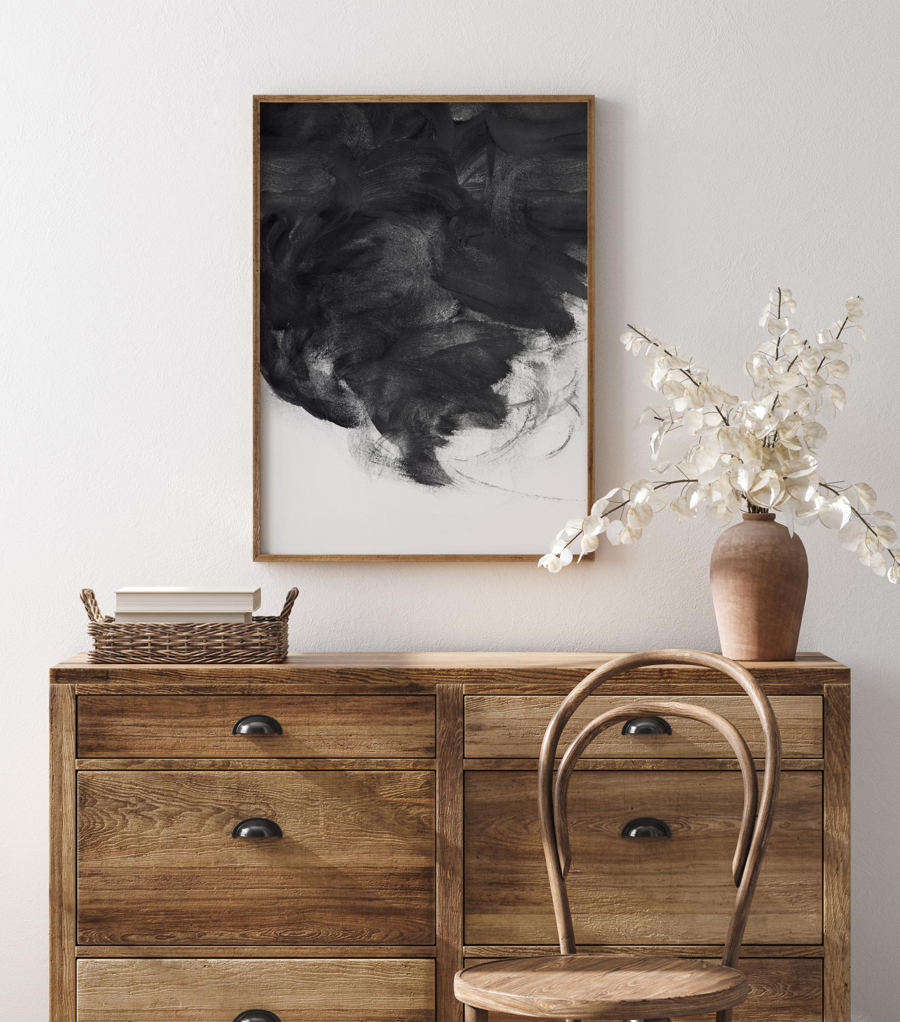 Apstraktni poster crne spirale. Ovo fantastično crno-bijelo djelo vodi pogled od vrha do središta putem crne spirale. Tamo gdje se crna susreće s bijelom, možete zamisliti špilju, nevrijeme, oluju ili oblak na ovom posteru punom dinamike. Postavite ga na svijetli zid za dramatičan i epski dojam.
