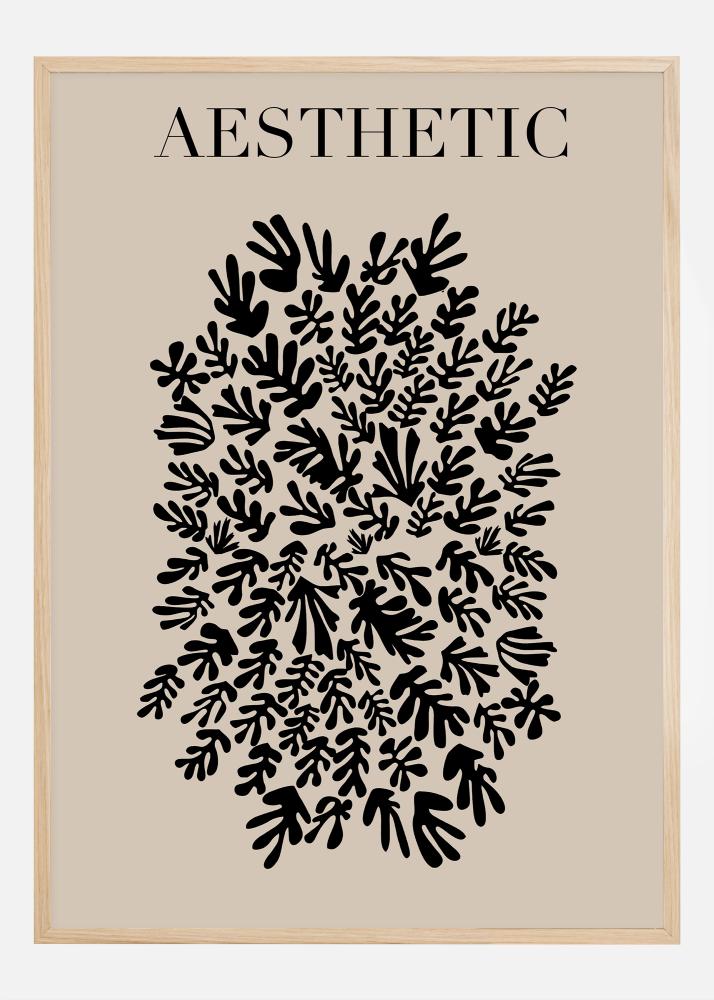 Sa svojim modernim izrazom i jednostavnom paletom boja, koja je ograničena na crnu i bež, ovaj print pruža umirujući i uravnoteženi dojam. Riječ "AESTHETIC" smještena u gornjem dijelu motiv pridonosi snažnom podsjetniku na vječnu ljepotu dizajna i prirode. Ovaj poster bi se izvrsno uklopio u interijer gdje se želi stvoriti oaza mira i inspiracije, ili kao dio veće galerijske stijenke za stvaranje okupljajućeg vizualnog doživljaja.