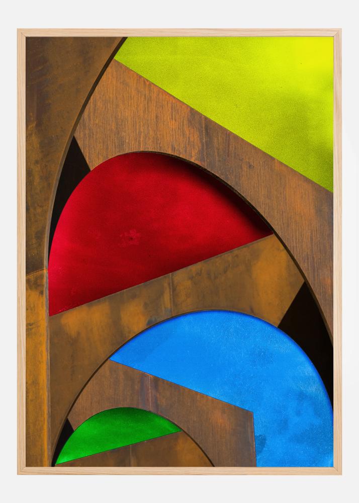 Svijetli apstraktni poster s kolorističkim oblicima. Primarne boje ispunjavaju ovo djelo s crvenim, žutim i plavim polukružnim oblicima. Ovi oblici su spojeni s ravnim drvorezom prema crnoj. Oživite dosadan i gladak zid ili ga uskladite s drugom postojećom smjelom bojom kako biste upotpunili djelo.