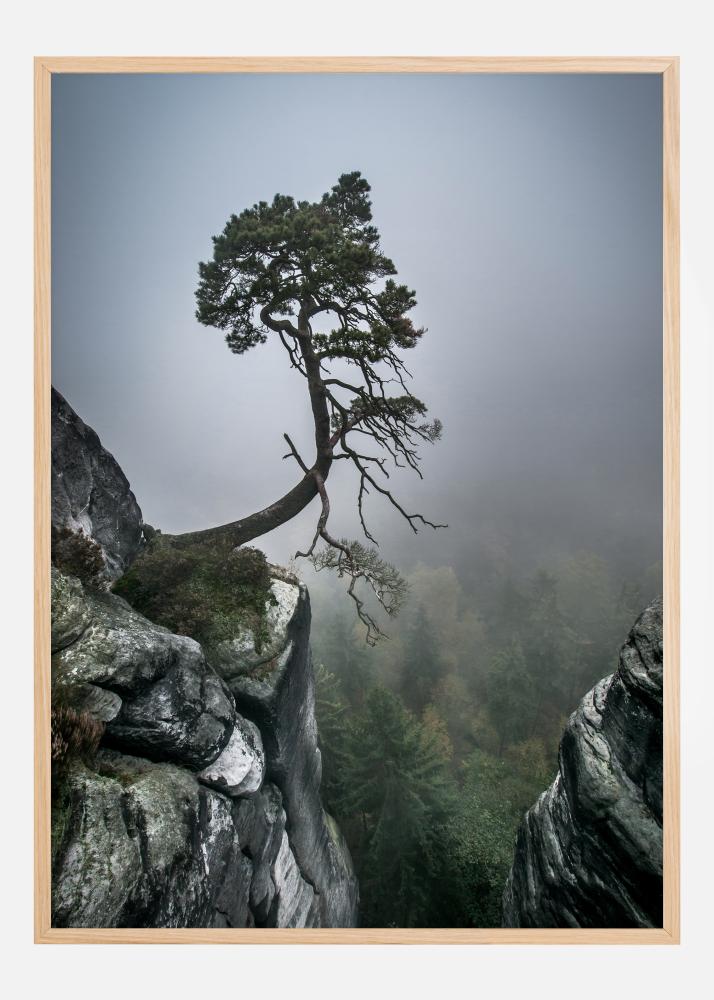 Dramatičan poster prirode iskrivljenog drveta koje raste na strani litice. U punom koloritu drvo se naginje u ponor između dvije sive litice. Maglovita šuma nazire se pri dnu, a svjetlost ističe drvo koje se penje. Ponesite dramu prirode kući kada kupite ovo djelo.