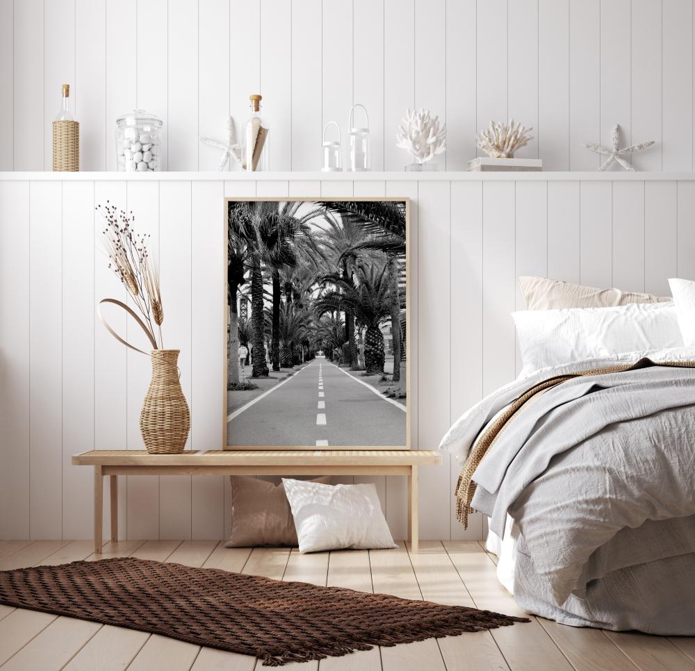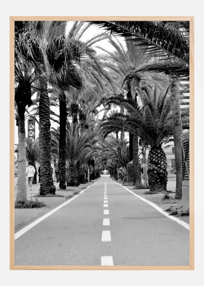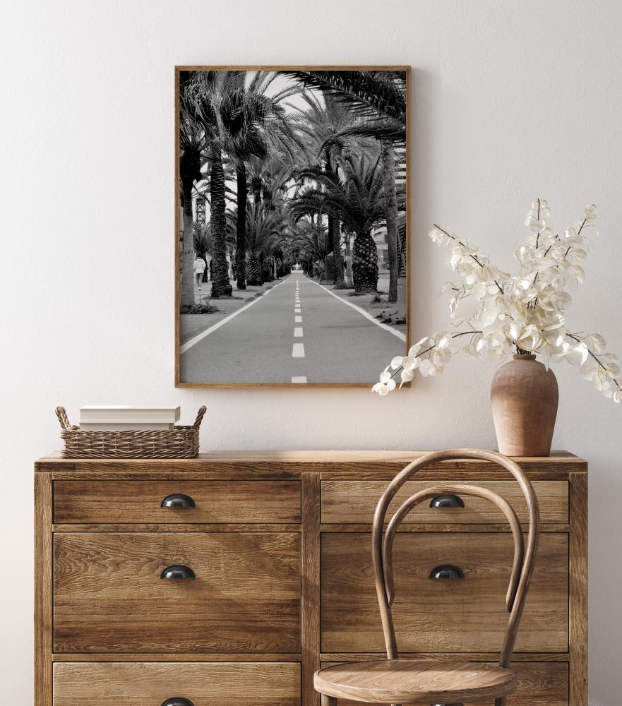 Krajobrazni poster dijela ceste koja prolazi kroz gaj s palmama. Palme stvaraju granicu za cestu dok bijele linije vode u daljinu. Drveće stvara luk koji usmjerava pogled u novom smjeru. Postavite ovu crno-bijelu ljepoticu na zid za egzotični dojam.
