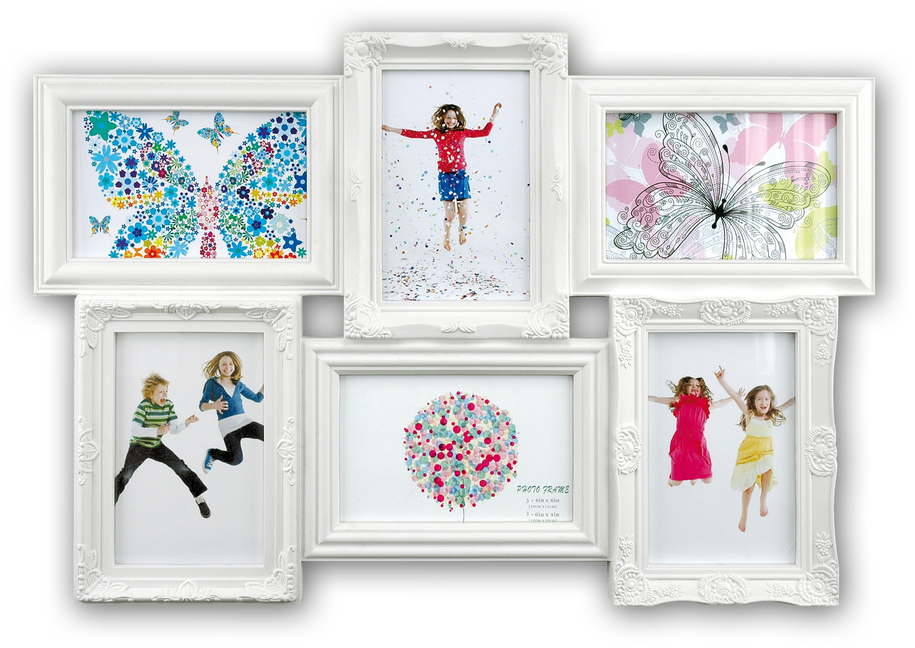 Lijepo ukrašeni okvir za kolaž u bijeloj boji s širokim profilom u klasičnom stilu. Savršeno za slike koje vam posebno znače.