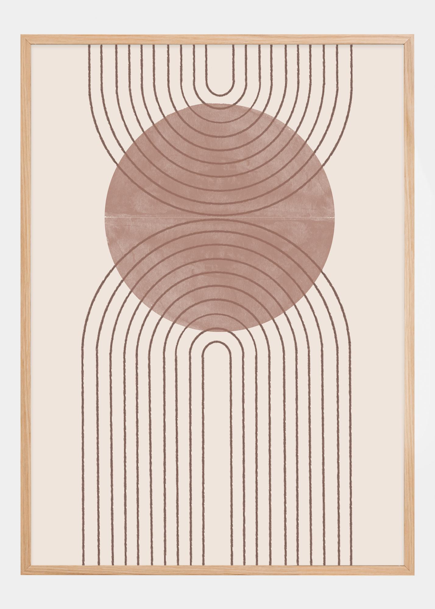 Ovaj poster unosi osjećaj mira i organski protok svojim nježnim, valovitim linijama koje se okupljaju oko središnjeg kruga u toploj, terakota nijansi. Umirujući uzorak podsjeća na pješčane dine oblikovane vjetrom ili mirne valove koji se kotrljaju prema obali, nudeći trenutak za razmišljanje i spokoj.