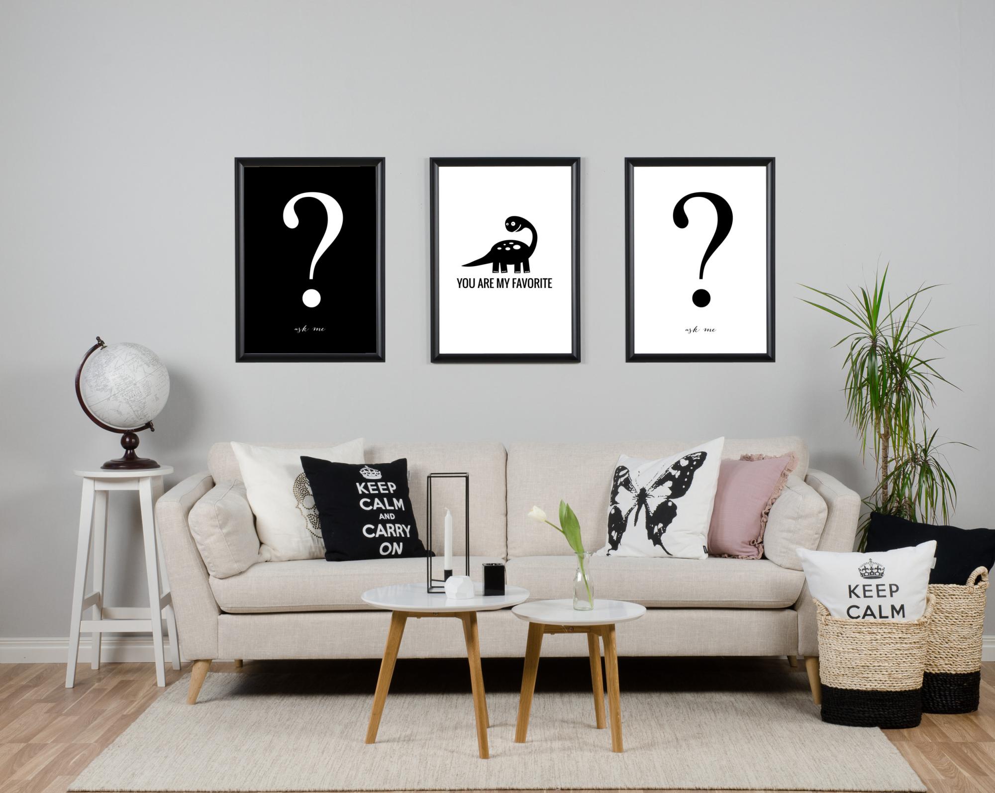 Elegantna grafička slika, Ask me, s tekstom i većim upitnikom u bijelom fontu na crnoj pozadini. Izgleda lijepo zajedno s drugim printovima na zidu s okvirima u dnevnoj sobi, ili neka gosti znaju da ste otvorena osoba već u hodniku. Poster je lijep zajedno s drugim tipografskim motivima u istoj seriji - Ask me, Do me ili Share me.
