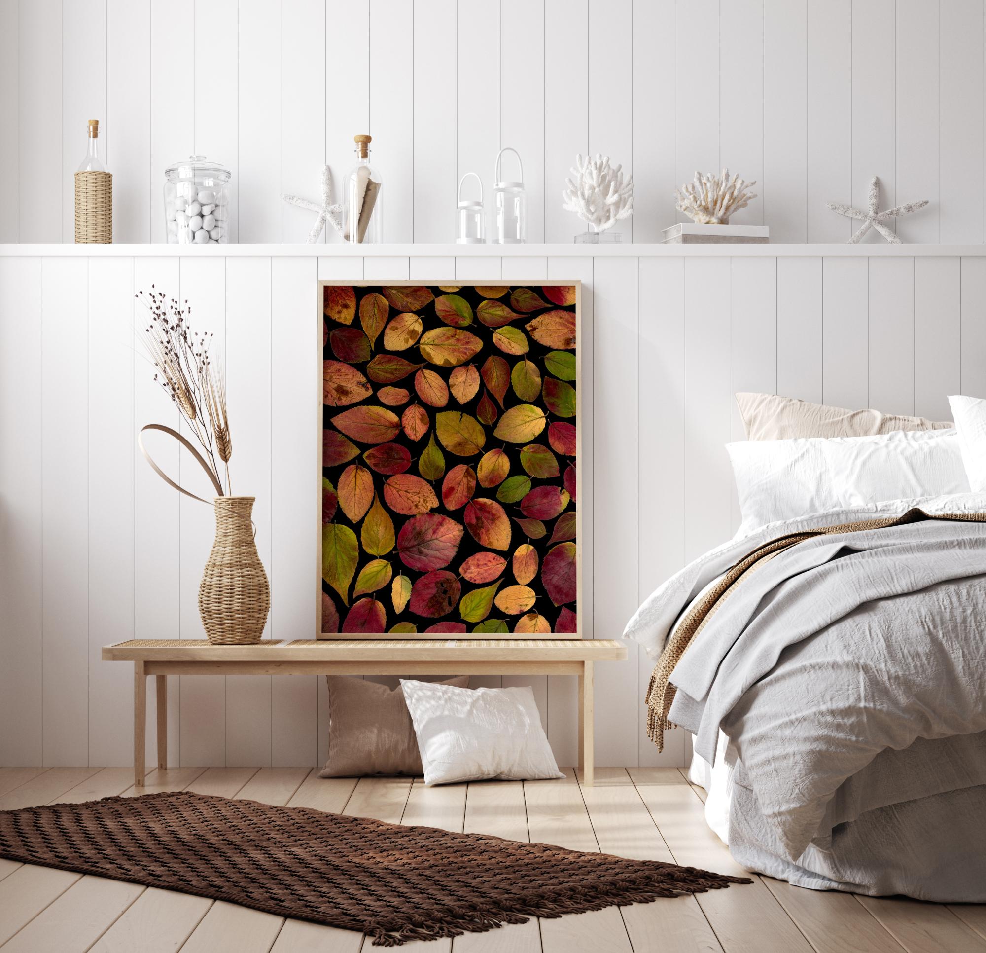 Plakat s uzorkom jesenjeg lišća. Niz žutih, ružičastih i crvenih boja susreće oko u ovoj organiziranoj zbirci lišća. Svo lišće spaja se prema tamnoj pozadini, donoseći jesenju živahnost u ovaj plakat. Savršen dodatak boje u kuhinji ili hodniku.