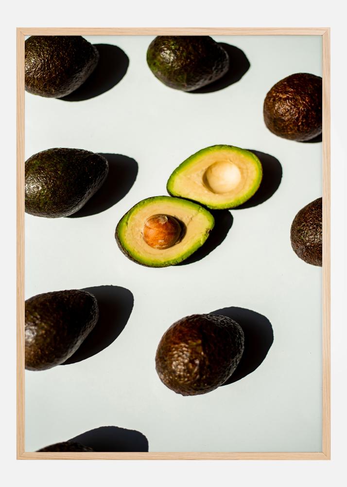 Ovaj poster odaje poÄast jednostavnoj ljepoti avokada, voÄa koje je postalo ikona zdrave prehrane i modernih kulinarskih trendova. Tamnozelene, kvrgave kore cijelog avokada kontrastiraju s jednom polovicom koja je otvorena i otkriva glatku, svijetlozelenu unutraÅ¡njost i sjajnu, smeÄkastu jezgru. Ova igra izmeÄu teksture i boje nudi razigranu i ujedno elegantnu estetiku.