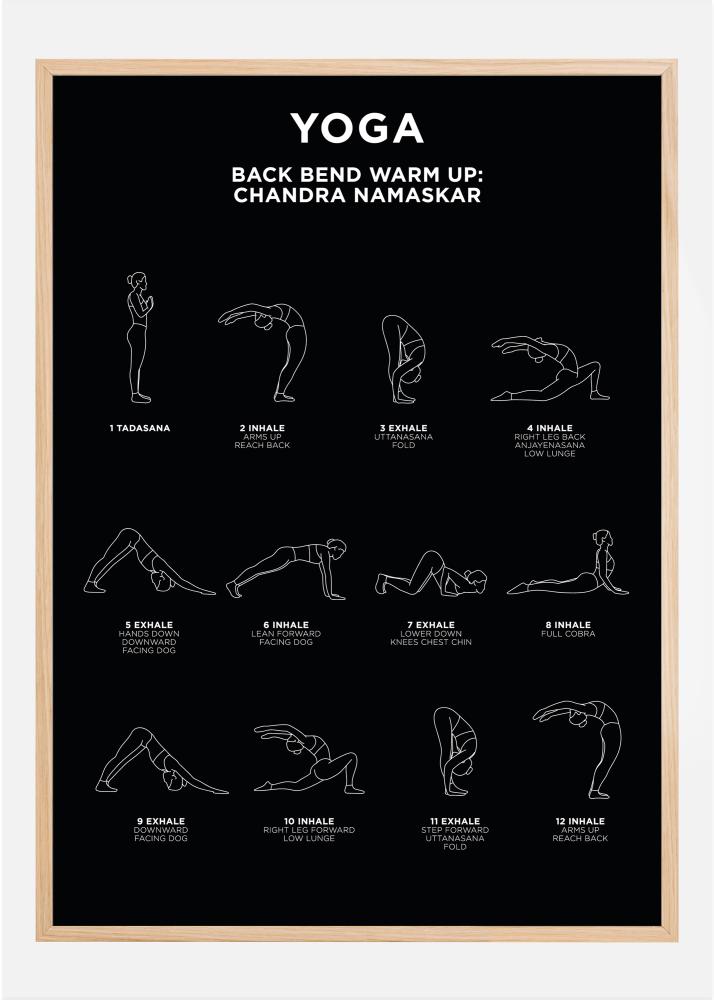 Plakat je elegantan s minimalističkim dizajnom, ali također služi kao pomoćna ruka kada želite naučiti jednu od klasičnih joga vježbi zagrijavanja ”Chandra Namaskar”. Plakat je dostupan u crnoj ili bijeloj boji i u nizu različitih veličina.
