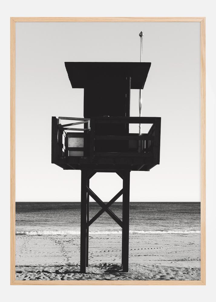 Ovaj monokromni poster prikazuje ikoniÄnu siluetu spasilaÄkog tornja protiv Äistog neba i mirnog mora. Snažan kontrast izmeÄu tamnog tornja i svijetlih tonova pijeska i neba daje slici grafiÄku kvalitetu koja je upeÄatljiva i suvremena. Slika, koja je snimljena u visini oÄiju, stvara osjeÄaj prisutnosti i mira, kao da stojite izravno na plaži i gledate preko prostranog mora.