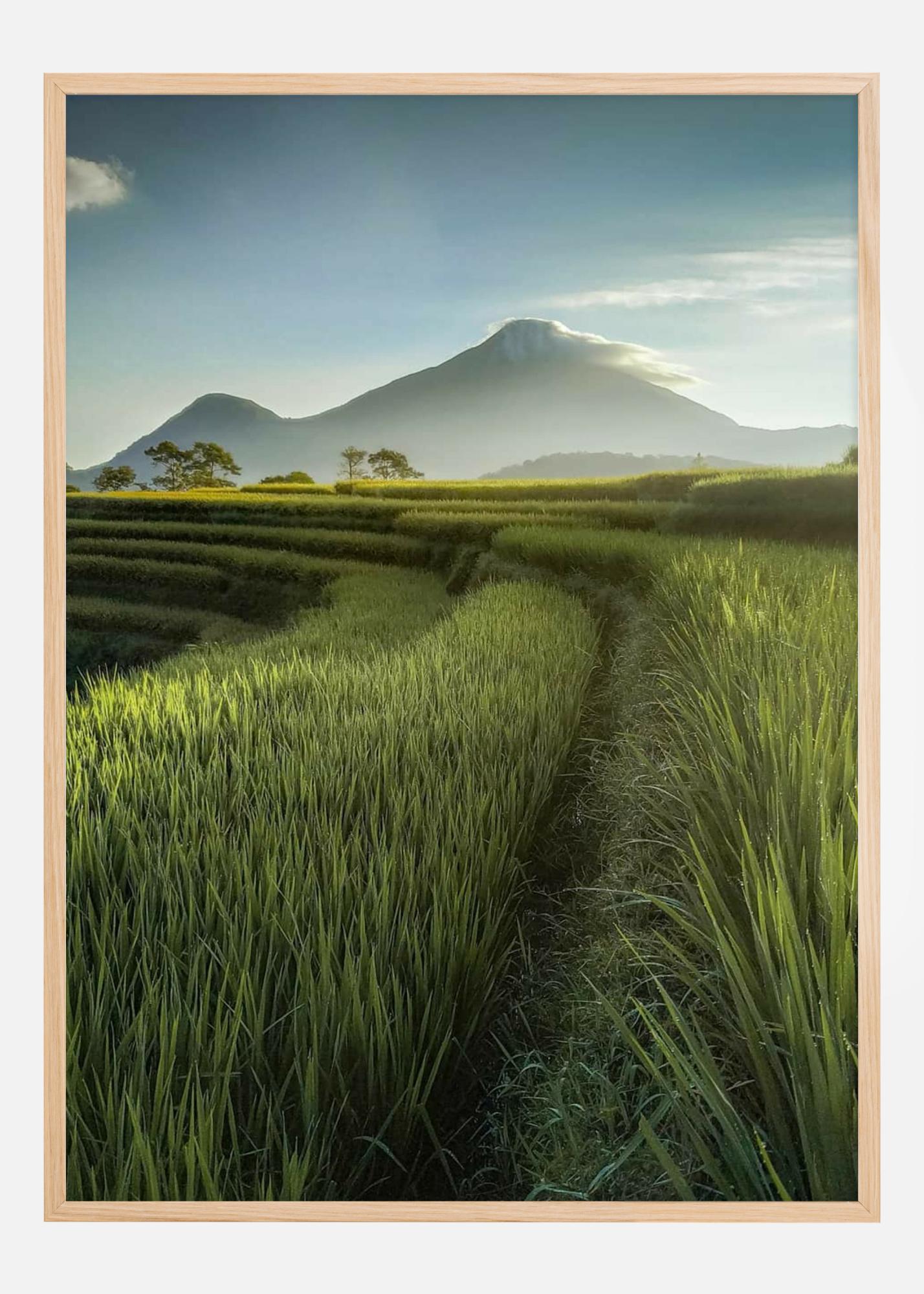 Ovaj poster nudi pogled na pastoralnu idilu, gdje se zelena rižina polja prostiru prema pozadini veličanstvenih planina i nježnom nebu. Svjetlost koja je preplavila krajolik daje topao i dobrodošao osjećaj, što čini ovaj print savršenim načinom da unesete dio prirodnog mira i ljepote u vaš dom ili radno mjesto.