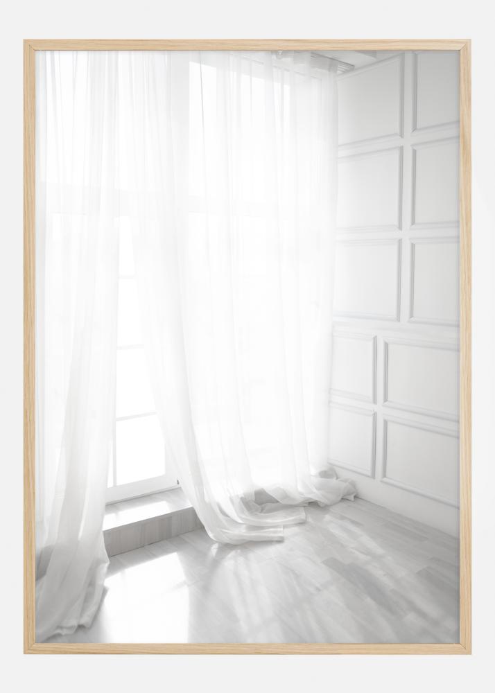Ovaj miran i proÄiÅ¡ÄavajuÄi poster prikazuje tihi kutak sobe obavijen prozirnim bijelim zavjesama. Svjetlost koja se probija kroz tkaninu stvara igru sjena i nijansi na blistavom podu, pružajuÄi osjeÄaj spokojstva i jasnoÄe. Ovaj minimalistiÄki print izražava smirenost i savrÅ¡eno bi odgovarao u okruženju koje teži jednostavnosti i miru.