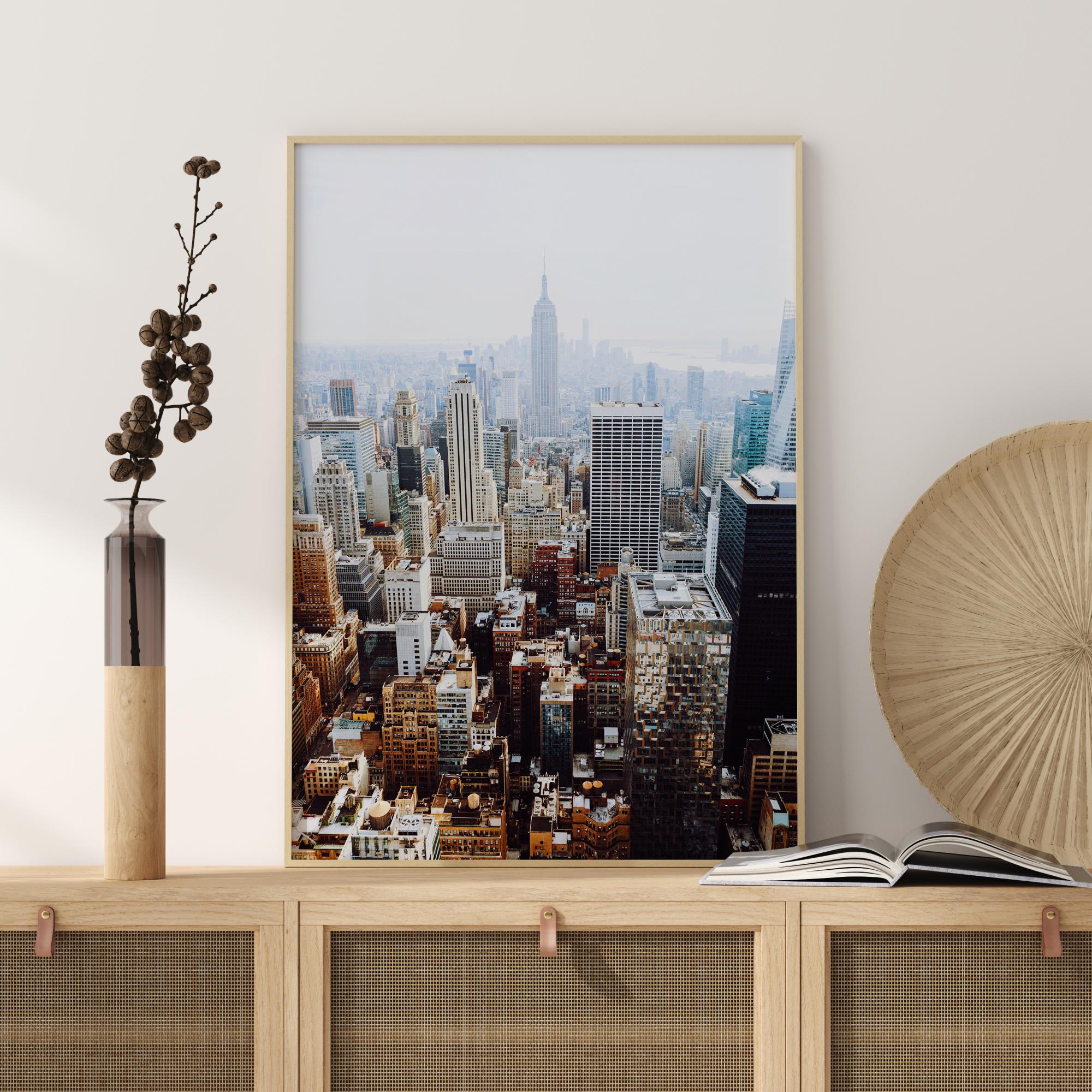 Poster iz zraka s prikazom gradske jezgre New Yorka s Empire State Buildingom u daljini. U prednjem planu boje su zlatne i žute, a zatim se stapaju u pozadini s hladnijim plavim i sivim tonovima. To je opadajući fokus na slici koji stvara dubinu. Ponesite ovo djelo kući i uživajte u umjetničkom izrazu gradskog života.