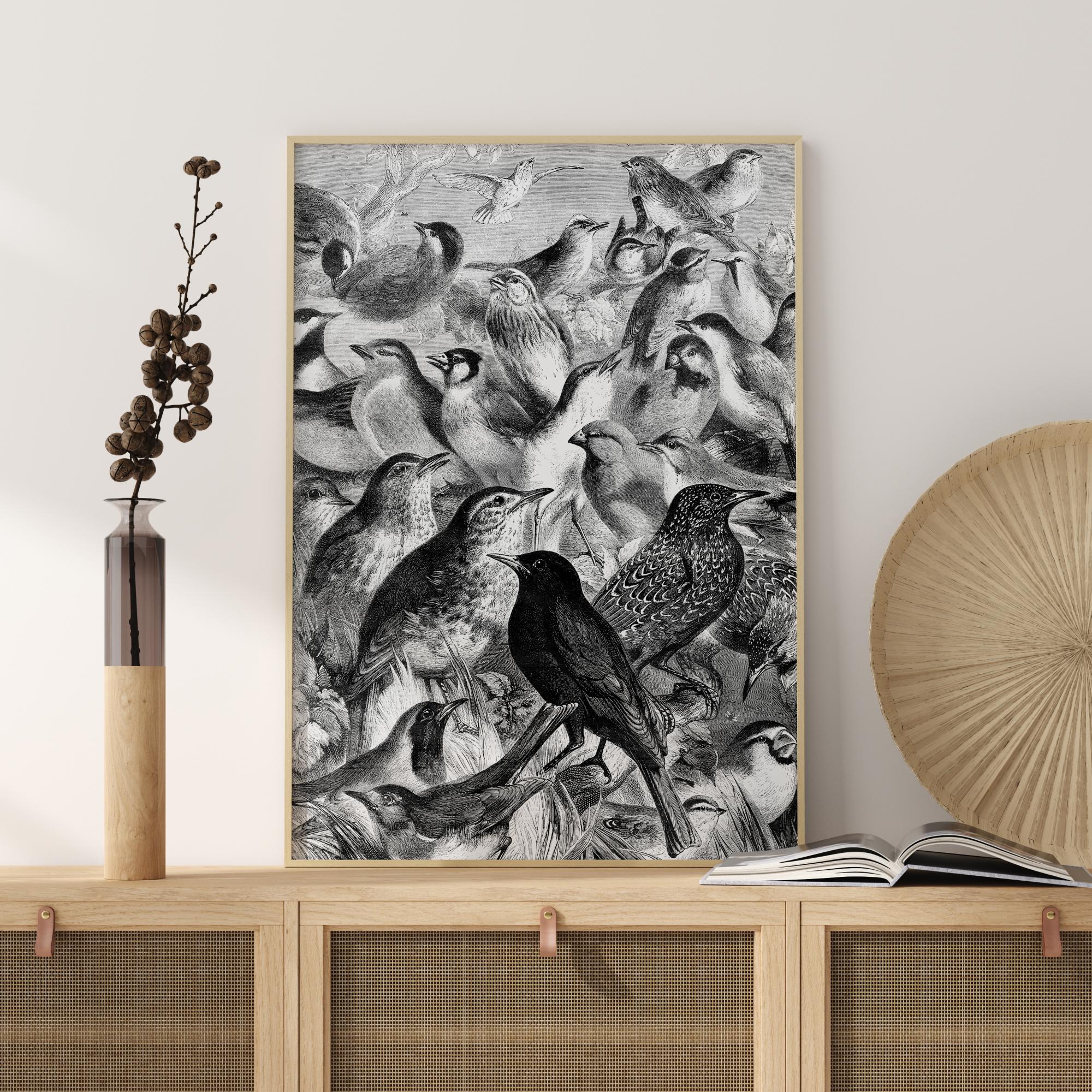 Crno-bijeli poster s različitim pticama. Naučite sve o pticama uz pomoć ovog otiska s različitim britanskim pticama. Ostanite zauzeti dok otkrivate ptice na slici i naučite nešto o njima. Omogućite im da se još više istaknu objesivši sliku na svijetlu obojenu zid.