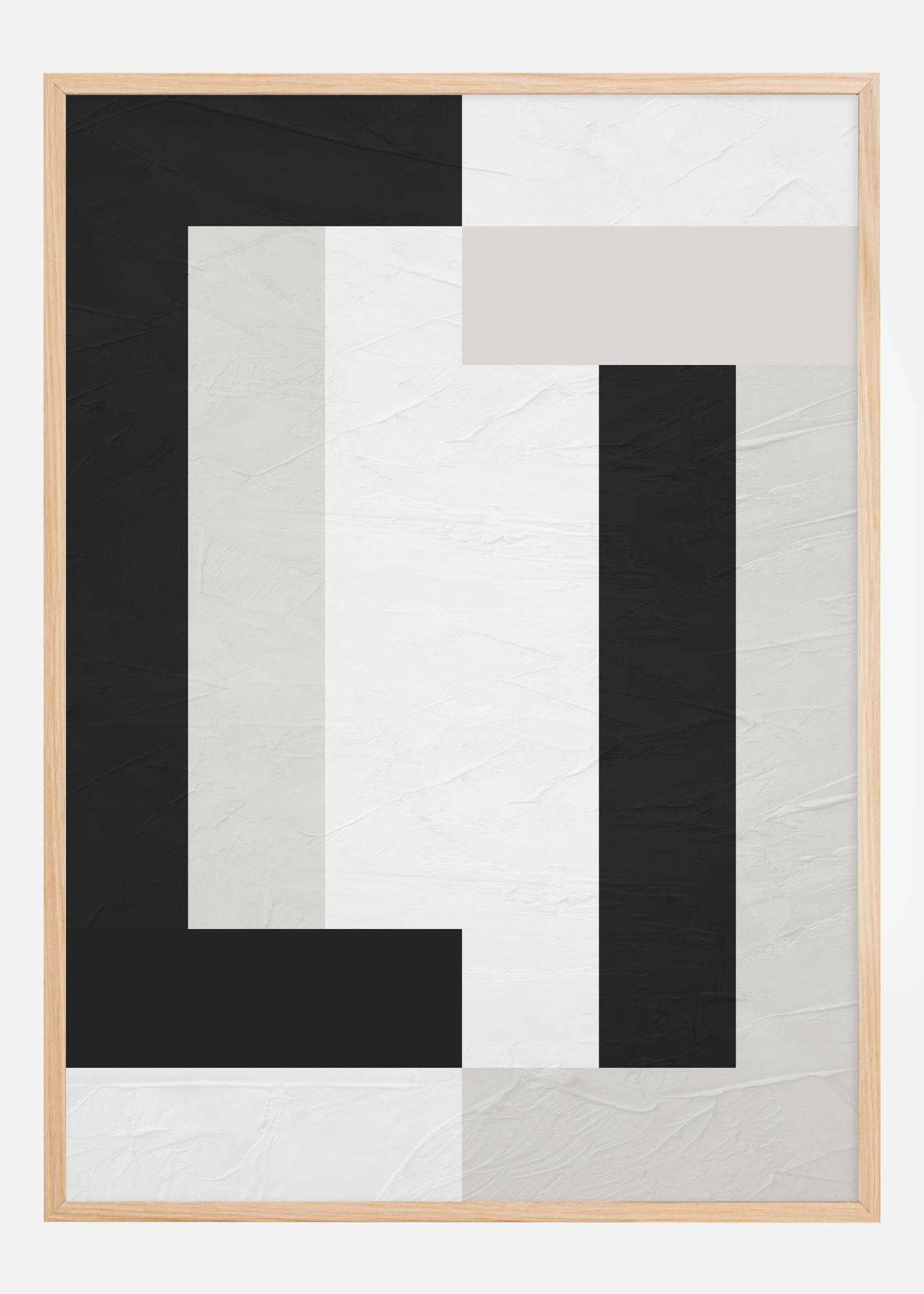 Ovaj jedinstveni poster kombinira jednostavnost moderne umjetnosti s hrabrim geometrijskim dizajnom. Kontrastna igra između crne i bijele podijeljena je u pravokutne blokove i linije koje zajedno stvaraju dojam ravnoteže i asimetrije. Idealna za one koji cijene snažne vizualne izraze, ovaj print savršeno se uklapa u minimalistički ili suvremeni dom. Nudi elegantnu jednostavnost koja može postati središnja točka prostorije ili doprinijeti većoj, složenijoj kompoziciji.