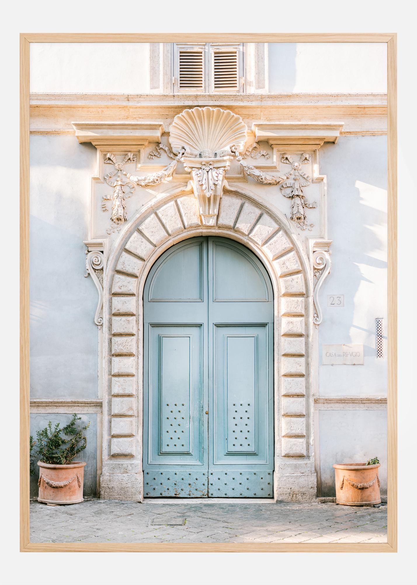 Ovaj poster hvata ljepotu i šarm klasične europske arhitekture. Svijetloplava dvostruka vrata okružena su elegantnim kamenom portalom, s fino izrezbarenim detaljima i ornamentima koji pružaju osjećaj povijesnog bogatstva i kulturnog nasljeđa. Iznad vrata nalazi se impresivan luk u obliku školjke koji dovršava ova veličanstvena ulazna vrata. Sa svake strane vrata nalaze se lonci sa zelenim biljkama, što dodaje prirodan i živahan kontrast kamenoj fasadi. Ova slika zrači mirnom i uzvišenom atmosferom, savršena za unošenje klasične ljepote u svaki dom.
