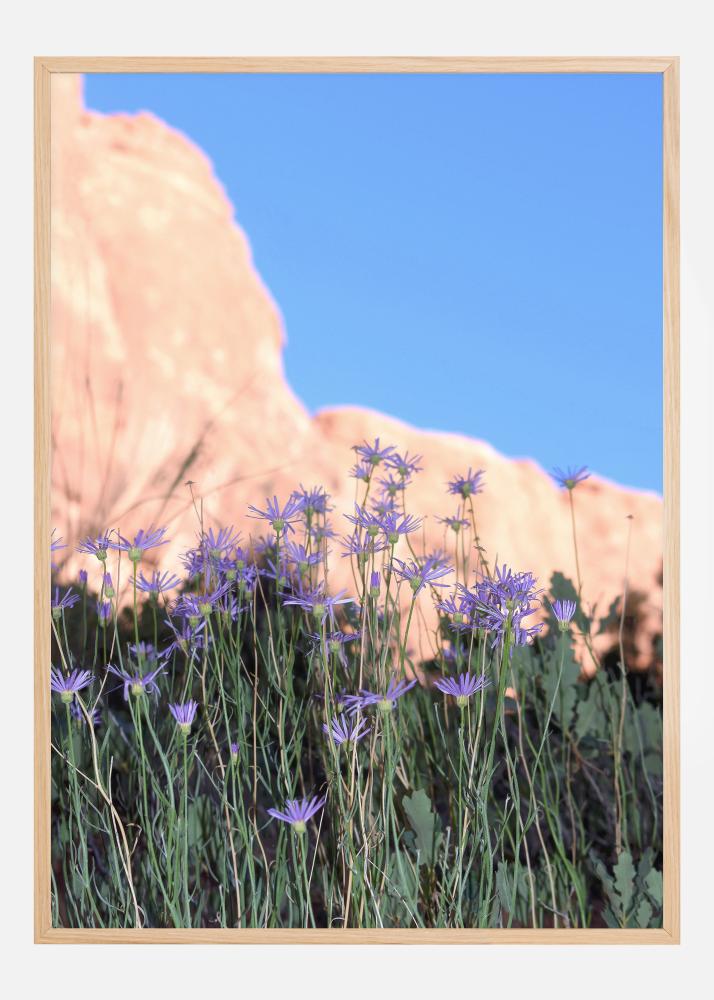 Zapanjujući prirodni poster s ljubičastim cvijećem, stjenovitim planinama i snažnim plavim nebom. Ljubičasti cvjetovi su u fokusu i pružaju se prema nebu dok planina u narančastoj čini granicu širokog prostranog neba. Dopustite sebi da se izgubite u prirodi kada donesete ovo djelo kući i objesite ga u svoju spavaću sobu.