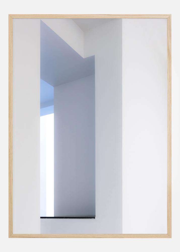 Poster za interijer sa zidovima i prozorom. Bijeli i sivi zidovi te geometrijski oblici vode pogled prema prozoru gdje je svijetli bijeli zid i plavo nebo vani. Objesite ovu sliku u malo mračnijoj sobi da biste dobili osjećaj i iluziju svjetla i prostora.