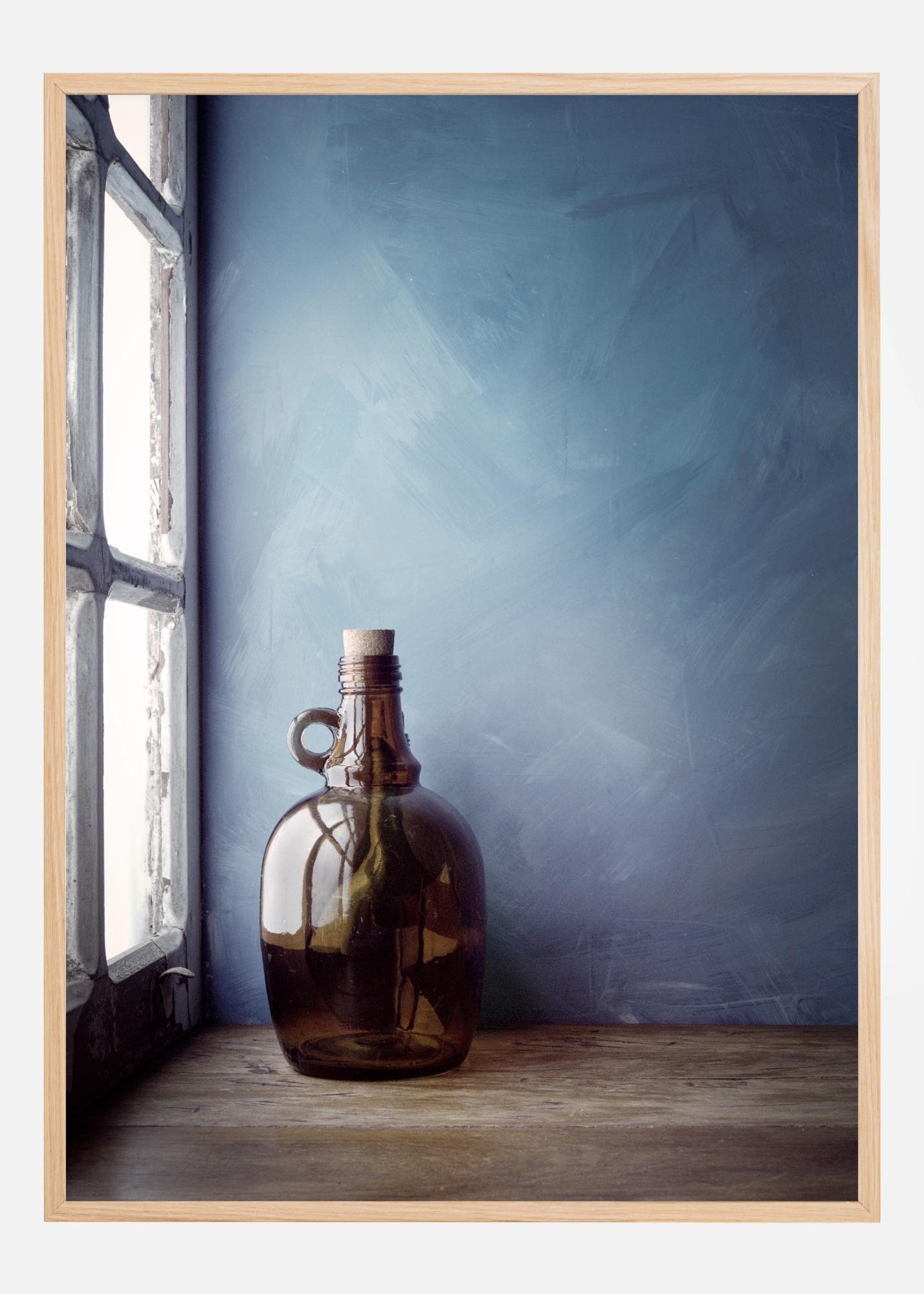 Poster mirnog života s smeđom bocom nasuprot plavog zida. Svjetlost iz prozora dolazi s lijeve strane i osvjetljava bocu stvarajući refleksije. Dodajte rustikalni osjećaj svom domu uz mekani plavi zid i stari drveni stol na kojem boca stoji.