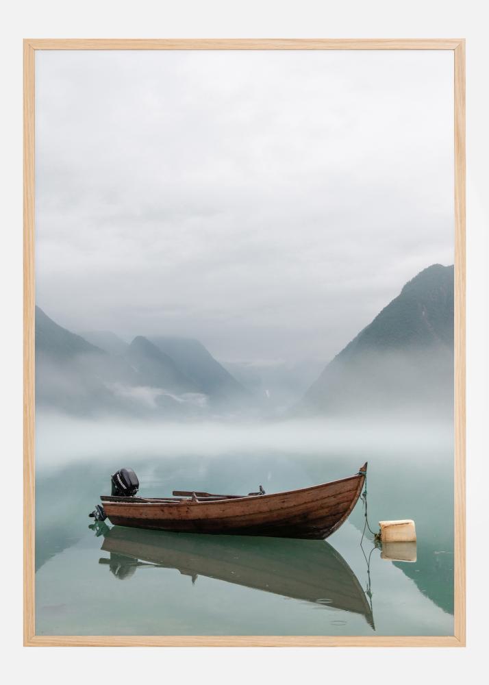 Elegantni poster s čamcem u sredini maglovitog jezera. Smeđi čamac ističe se jasnim detaljima u prvom planu s oštrom refleksijom u vodi. U pozadini, obavijena maglom, stoje mekane planine koje izviru iz vode. Unesite mir otvorenog krajolika u svoj dom.