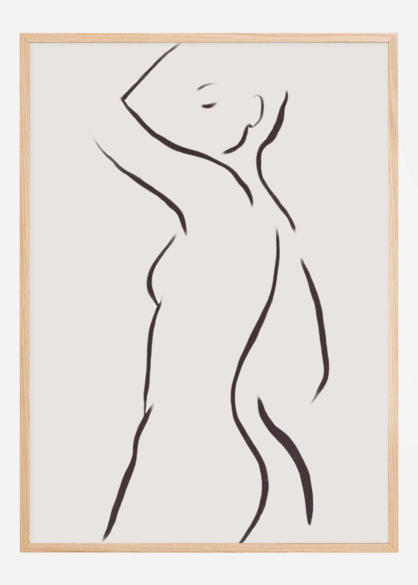 Crno-bijeli poster s motivom žene koja se ispružila prema gore. Jednostavni potezi kistom stvaraju fluidni oblik glave i torza ove žene dok stoji snažno, ali smireno. Gleda dolje, dok podiže lijevu ruku visoko. Uskladite sliku sa svijetlim zidom kako bi linije bile istaknutije.