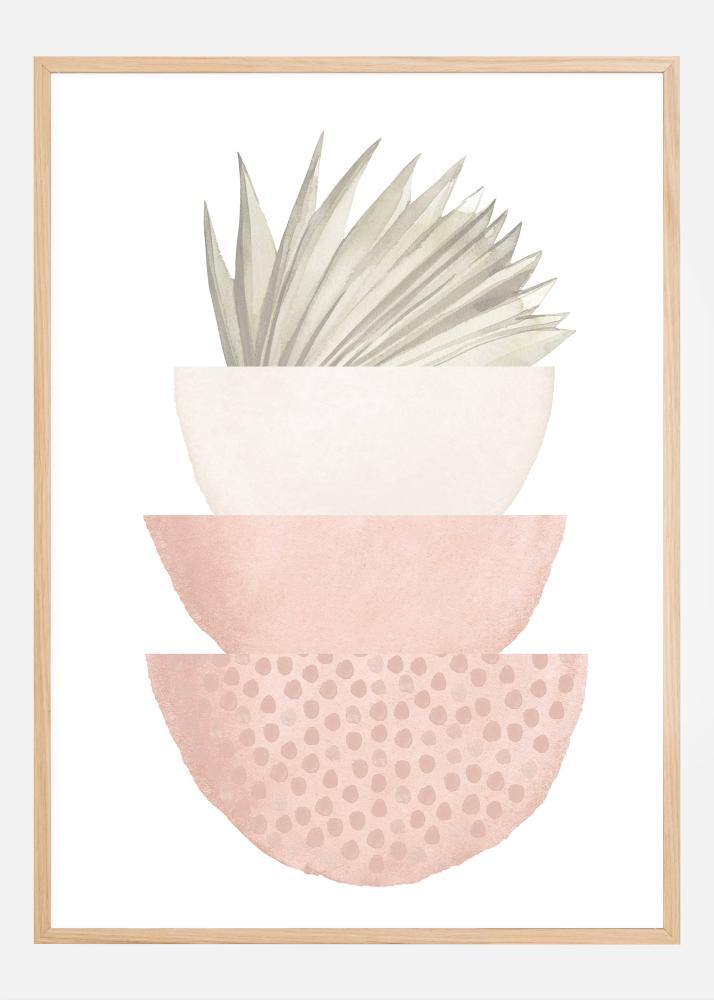 Ovaj elegantni poster je posveta minimalističkom dizajnu i ogoljenoj estetici. Sivkasto-zelena biljka izranja iz polukružne zdjele u ružičastim tonovima s delikatnom dugmastošću teksture, sve postavljeno na neutralnoj pozadini. Kontrast između stroge biljke i meke zdjele stvara ugodnu ravnotežu. Ovaj umjetnički print je savršen za pružanje opuštajućeg i organskog osjećaja prostoriji i dobro se uklapa u moderni, skandinavski ili boemski stil uređenja.