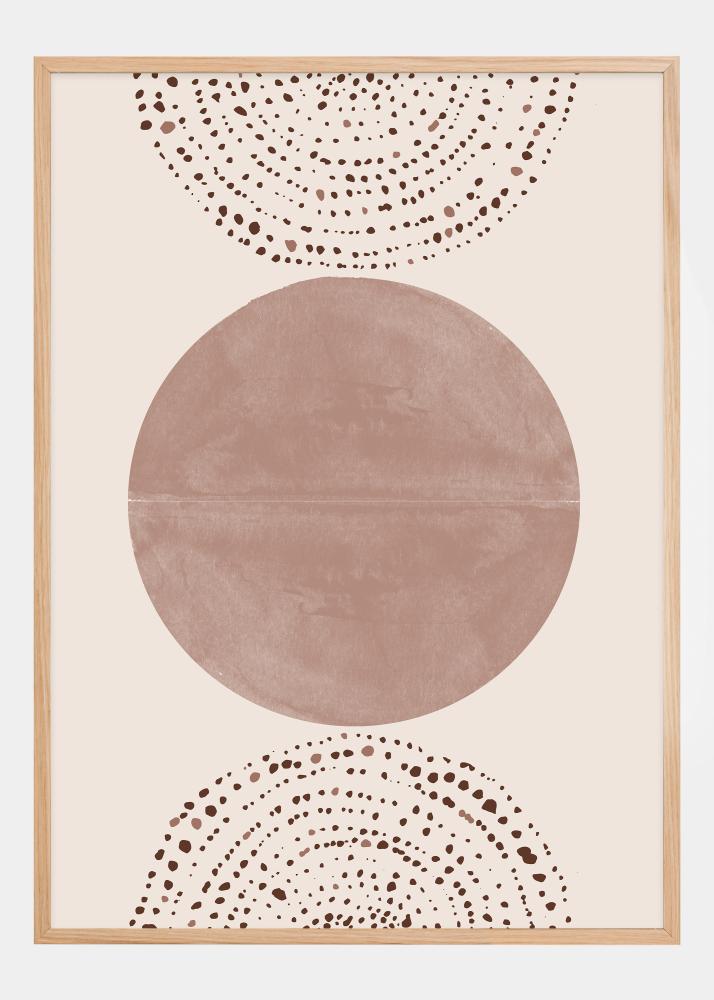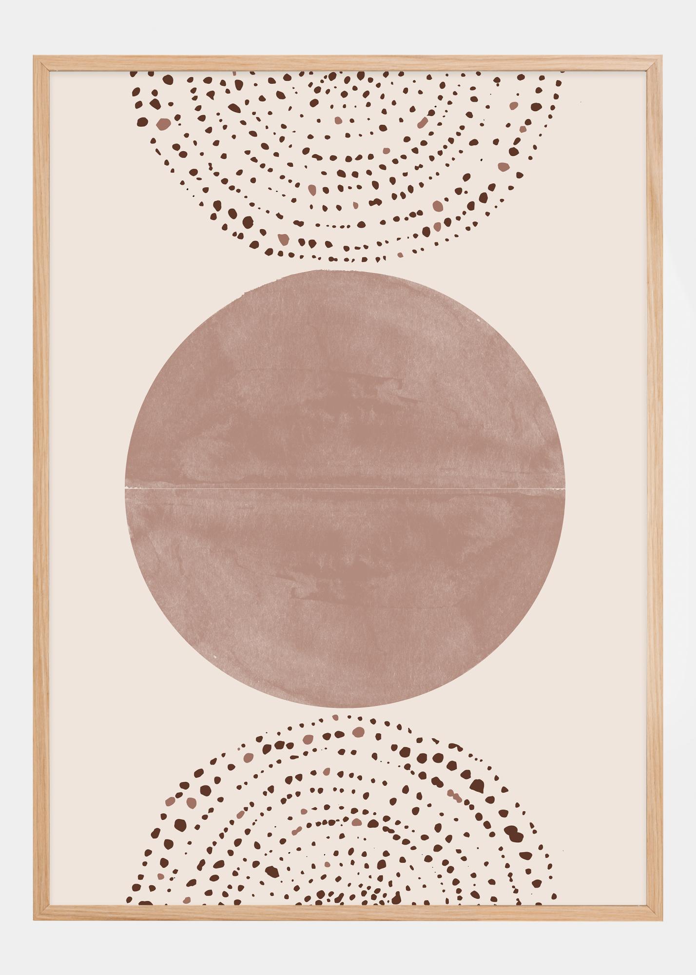 Ovaj sofisticirani i umirujući poster ističe veliku, mekanu terakota boje kružnicu kao središte u kompoziciji finih, raspršenih točkica koje tvore lebdeće polukrugove iznad i ispod. Ovaj motiv inspiriran je boemskim dizajnom i pruža opuštajući, prizemni osjećaj, a ujedno unosi moderan dodir u prostoriju koju krasi.