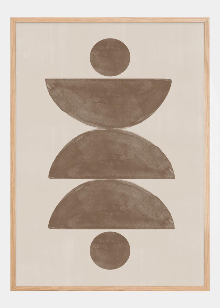 Ovaj umirujuÄi i estetski zadovoljavajuÄi plakat prikazuje harmoniÄno slaganje mekih geometrijskih oblika. Dva polumjeseca u zemljano smeÄi ton balansirana su s dva puna kruga, simetriÄno postavljena iznad i ispod. Ova minimalistiÄka kompozicija nudi osjeÄaj mira i savrÅ¡ena je reprezentacija boemskog stila s mekim i modernim privlaÄenjem.