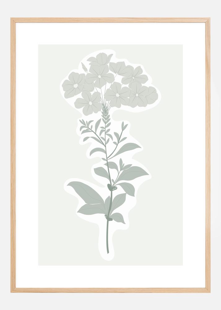 Poster s jednostavnim botaničkim tiskom cvijeta i njegovih listova. Mekane sivozelene boje čine ovu jednostavnu, ali ipak elegantnu, stabljiku s cvjetovima. Uokviren u bijelo i sivo, ovaj tisak oživljava sjećanja na staromodne botaničke ilustracije. Prikaži dio svog vrta uz pomoć ovog očaravajućeg tiska.