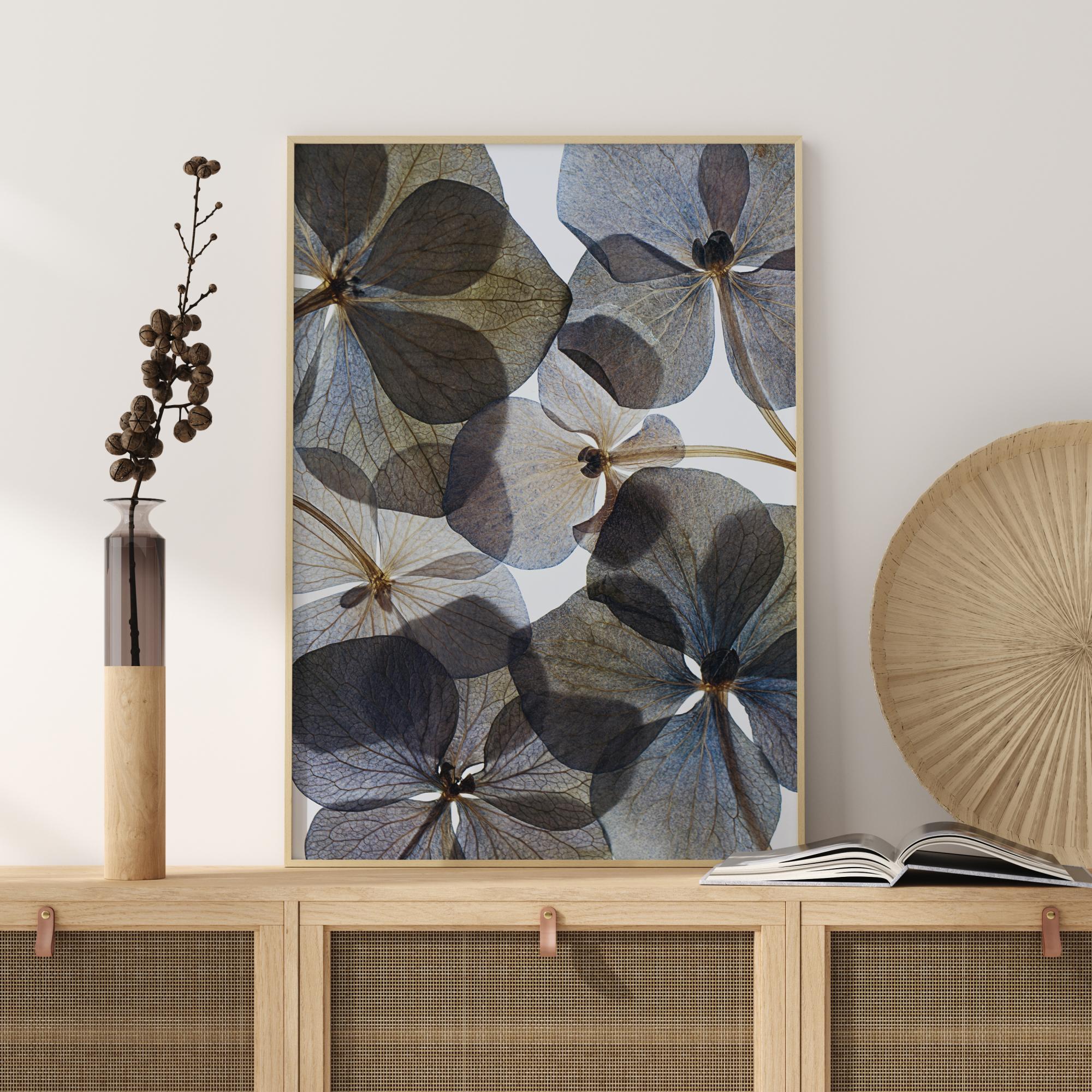 Botanički poster ispunjen prozirnim plavim i smeđim cvjetovima. Bijela svjetlost u pozadini sja kroz ove latice, od kojih se neke preklapaju, čineći ih tamnijima. Objesite ovo djelo i zamislite da se nalazite ispod ovih prekrasnih, širokih latica kako biste bili okruženi mirnom atmosferom.