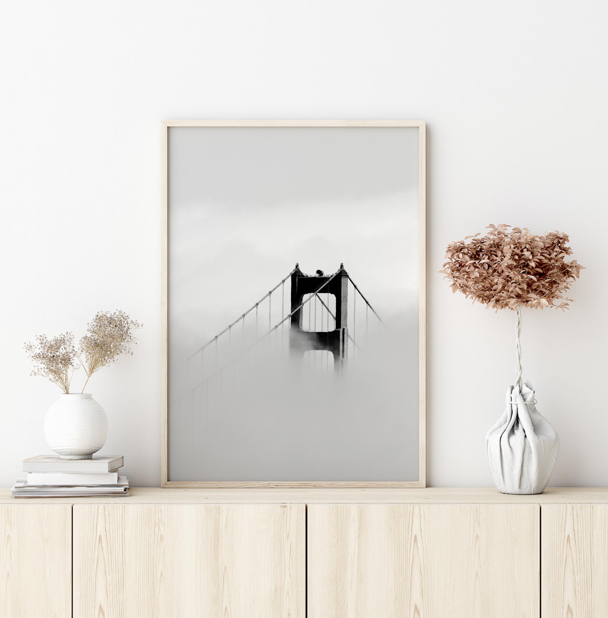 Dramatičan poster s vrhom mosta. Magla se diže i skriva cijeli most osim vrha. Crn i čvrst, most se uzdiže između oblačnog neba iznad i magle ispod. Uživajte u ovoj fantastičnoj slici kada imate ovu poster na zidu.