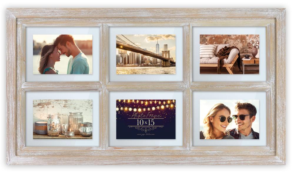 Horizontalni okvir za kolaž u svijetlom drvu. Ovo je okvir koji može primiti 6 fotografija u veličini slike 10x15 cm, i omogućuje vam da jednostavno organizirate grupu slika zajedno na lijep način. Okvir ima malo drvenih detalja koji mu daju rustičan, ali istovremeno seoski karakter. Vanjske dimenzije okvira su 38,5x69,5 cm. Zidni nosač je uključen.