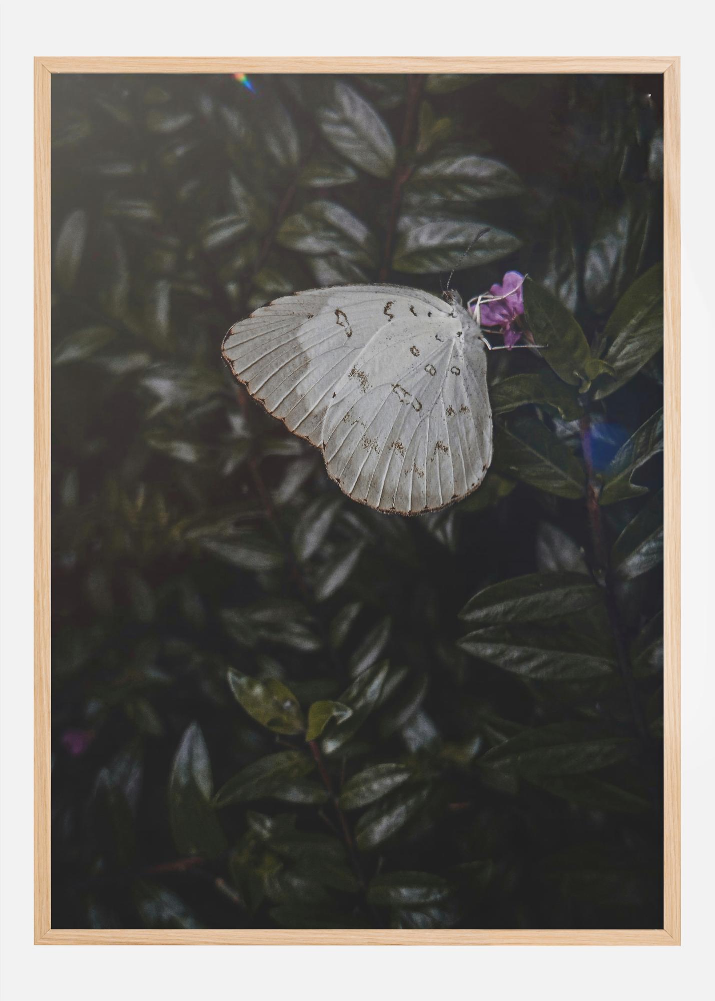 Otkrijte tihu ljepotu prirode putem ovog plakata koji prikazuje delikatnog leptira u mirovanju. Elegantno je smjeÅ¡ten na bujnoj pozadini tamnozelenih listova, a njegova blijedobijela krila sa suptilnim uzorcima sive i crne naglaÅ¡avaju njegovu krhkost i gracioznost. Ova slika je tihi podsjetnik na prolazne i oÄaravajuÄe trenutke prirode.