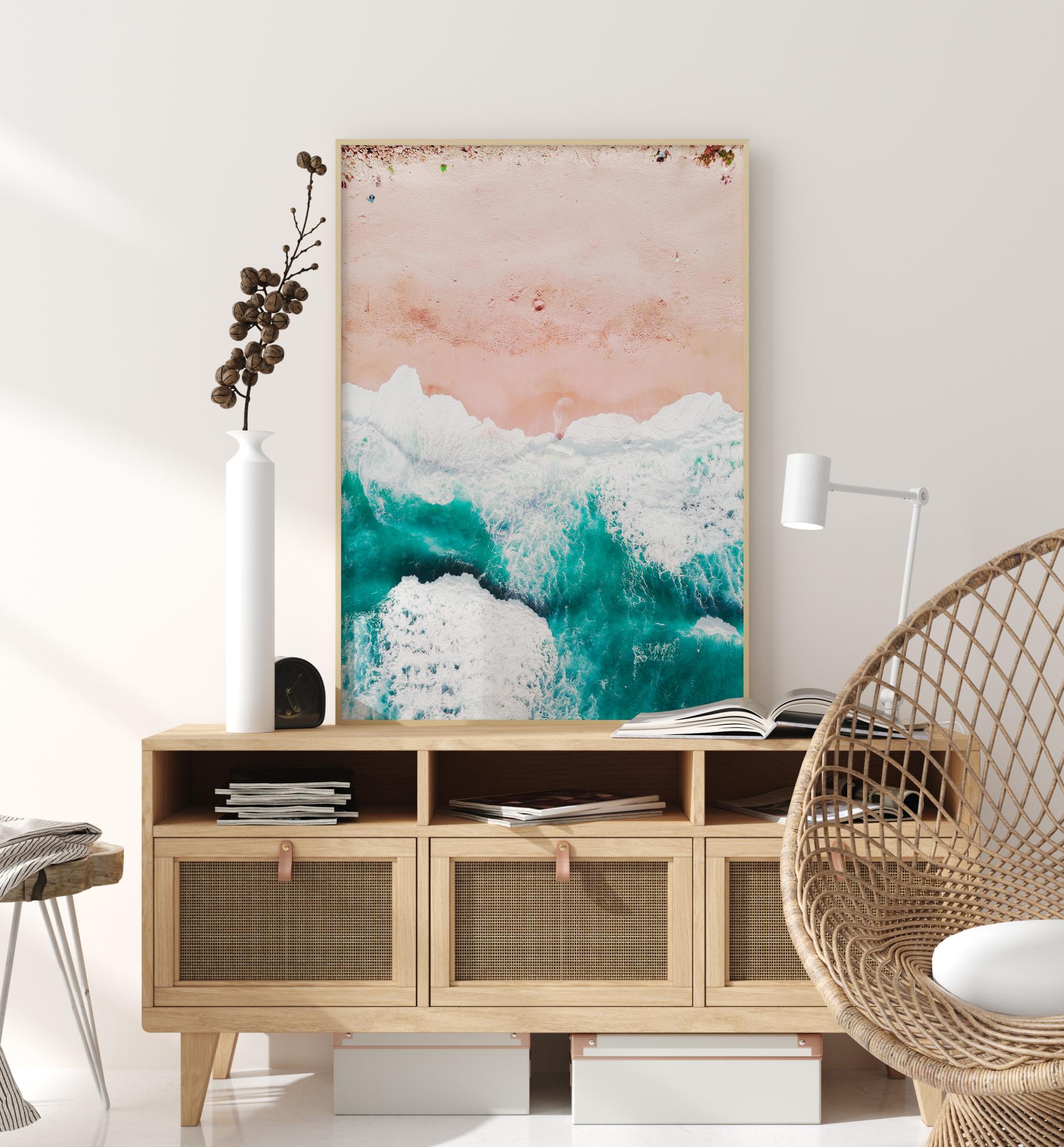 Poster s prizorom iz zraka s valovima svijetloplave boje koji dosežu pješčanu plažu. Pjenasti valovi udaraju o mekanu pastelno ružičastu plažu. Neki vrhovi u drugim bojama prikazuju ljude koji sjede na plaži. Boje čine sliku savršenom za upotpunjavanje vašeg dekoriranja kupaonice.