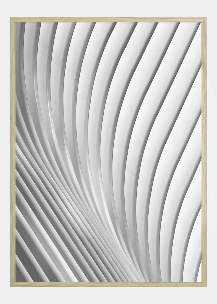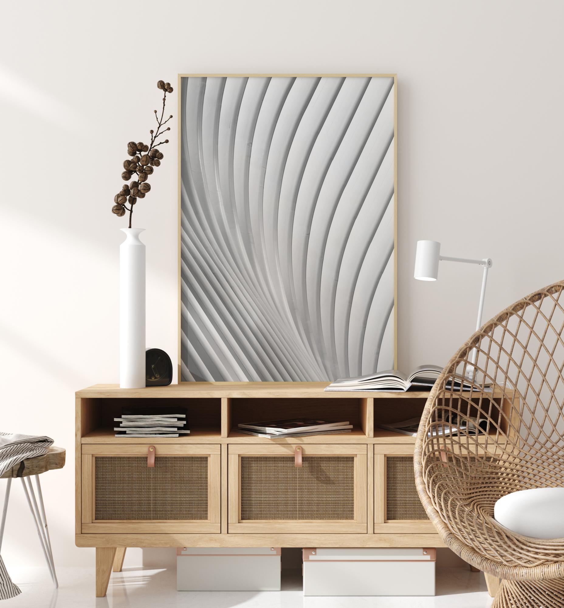 Apstraktni poster s valovitim bijelim i sivim linijama preko slike. Linije počinju dolje desno i nježno se savijaju prema gore prije nego što skrenu desno. Iako je jednostavna, ova slika privlači pažnju kada opustite oči i slijedite linije.