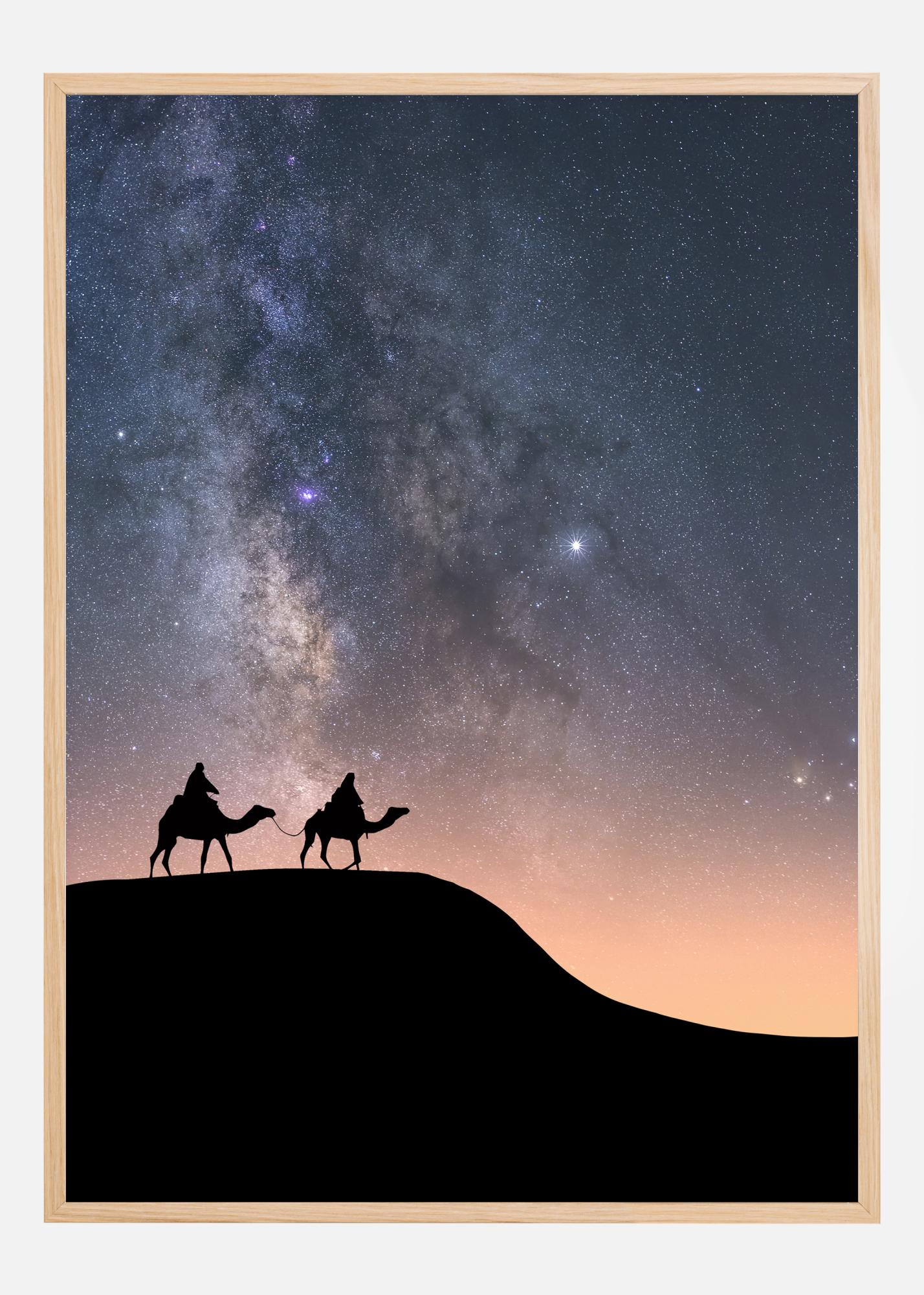 Dramatičan poster s dvije deve ispod zvjezdanog neba. Mliječna staza svijetli jarko dok su dvije deve sa svojim jahačima u silueti ispod zvijezda na ovoj epskoj fotografiji. Blijedo narančasti zalazak sunca dodaje mistiku ovoj sceni. Putujte na udaljeno mjesto kada objesite ovu magičnu scenu u svom domu.