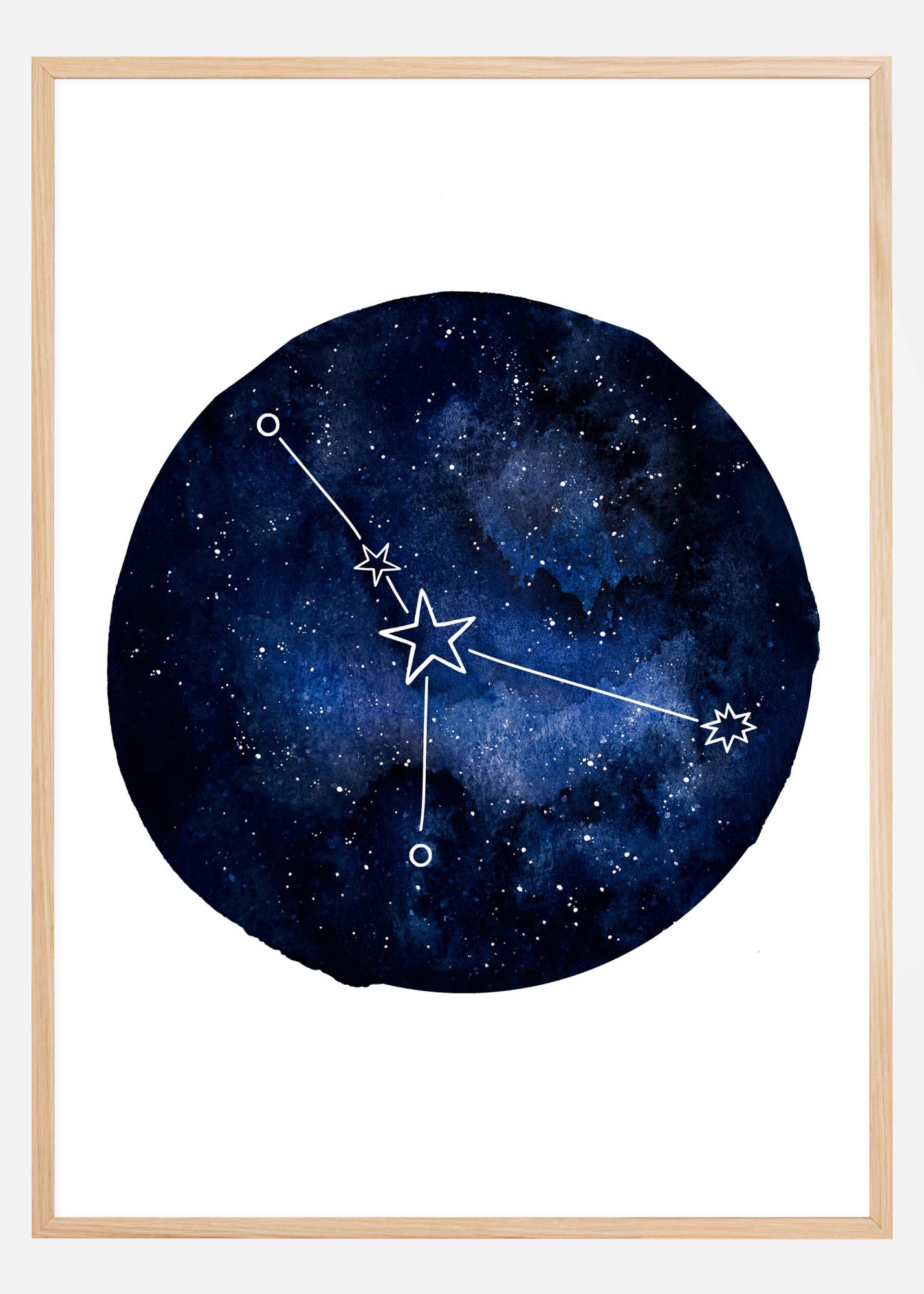 Plakat horoskopa s Rakom. Tamnoplavi krug ispunjava središte ove bijele slike. U krugu su različite nijanse plave kao i različite zvijezde. Horoskopski znak Raka je istaknut u centru. Ako volite svoj horoskopski znak, ova slika je obavezna na vašem zidu.