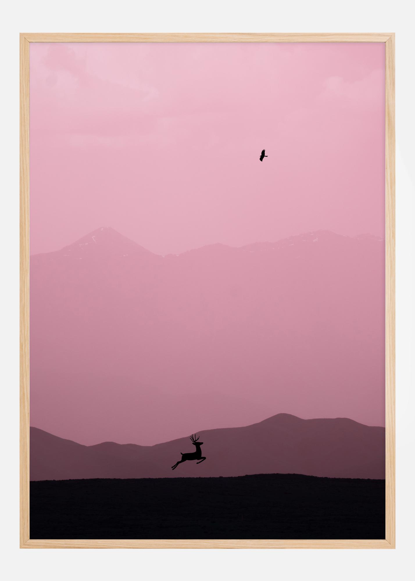Ovaj mirni i sanjivi poster hvata bit slobode i ljepote u prirodi. Silueta jelena uhvaćena u skoku preko siluete nježno valovitih brda pruža osjećaj kretanja i lakoće. Iznad svega se prostire nježno ružičasto nebo koje dodaje osjećaj topline i čuđenja. Usamljena ptica leti prema nebeskoj beskonačnosti, dodajući dodatnu dimenziju slobode i nevezanosti slici.